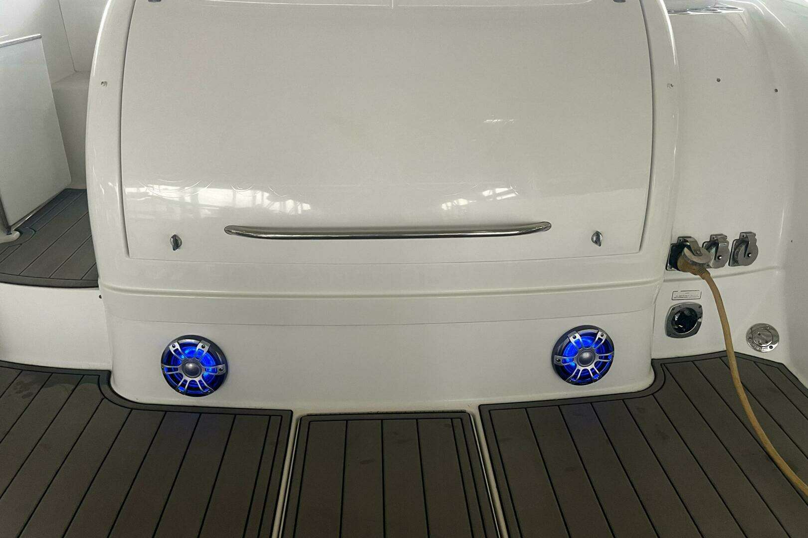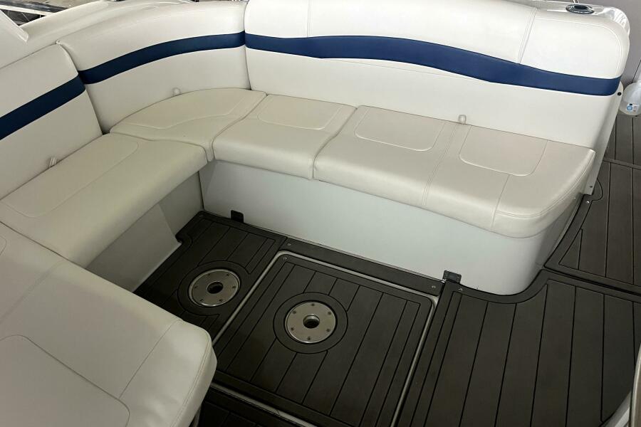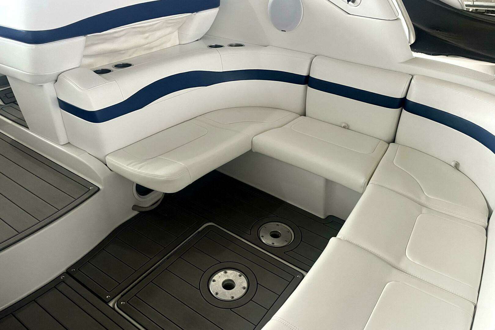 - Aft U-shaped lounge seating w/fiberglass-lined storage, two dual-height tables & sun pad inserts • Cockpit wetbar w/Corian® countertop, trash receptacle & 120V GFCI outlet