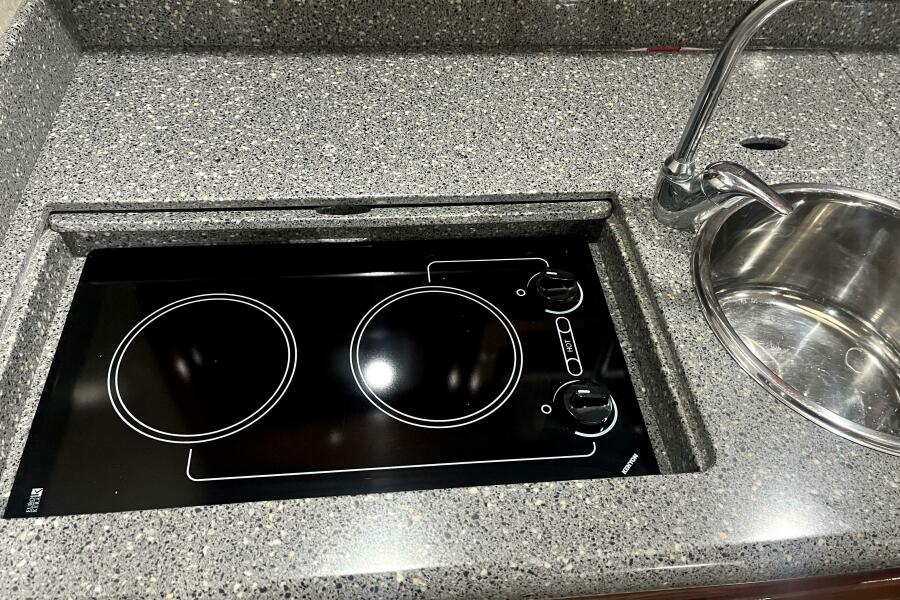 - Complete galley in deep cherry or cherry high-gloss finish w/ storage and hardwood dovetailed drawers, full Corian countertop, polished stainless sink, concealed 2-burner electric stove w/safety shut-off switch, concealed 120V/12V refrigerator, microwave oven & concealed in-counter trash receptacle