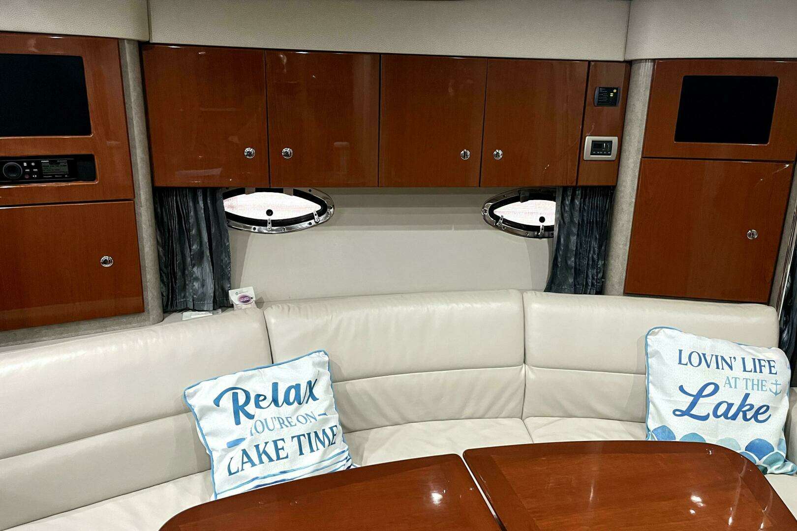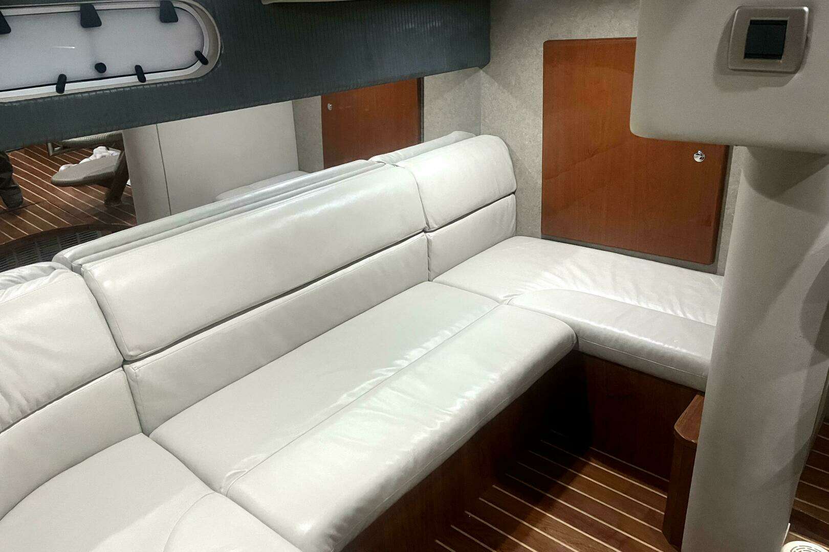 - Two cedar-lined forward stateroom hanging lockers w/automatic lights • Curved UltraleatherTM sofa seating w/dual-height, high-gloss wood cherry dining tables & filler cushions
