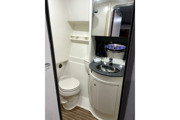 - Molded fiberglass private head compartment w/molded fiberglass vanity, Corian counter, stainless sink, VacuFlush® unit w/holding tank & dockside pumpout, separate stall shower w/hinged acrylic door & exhaust fan