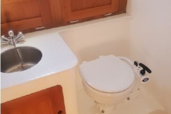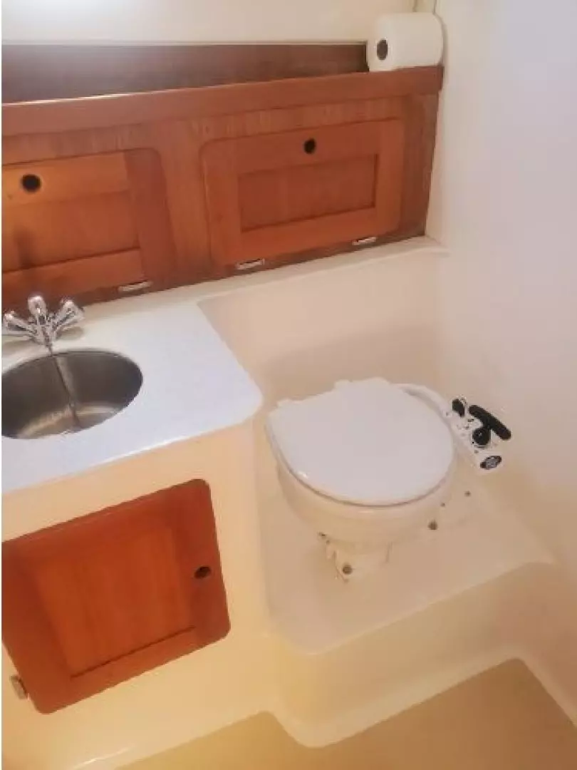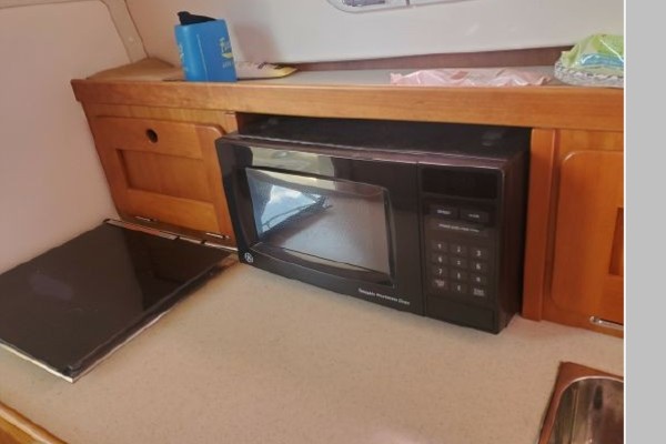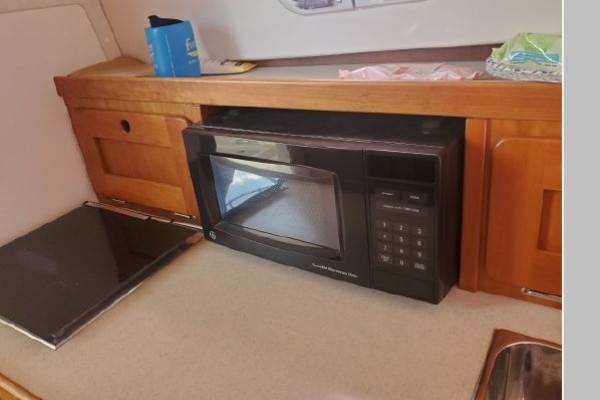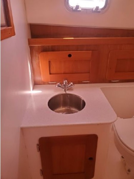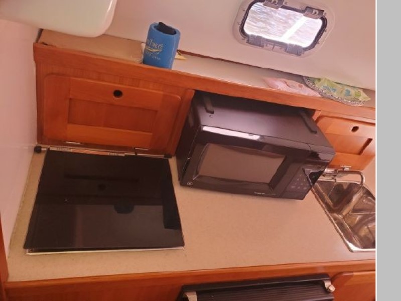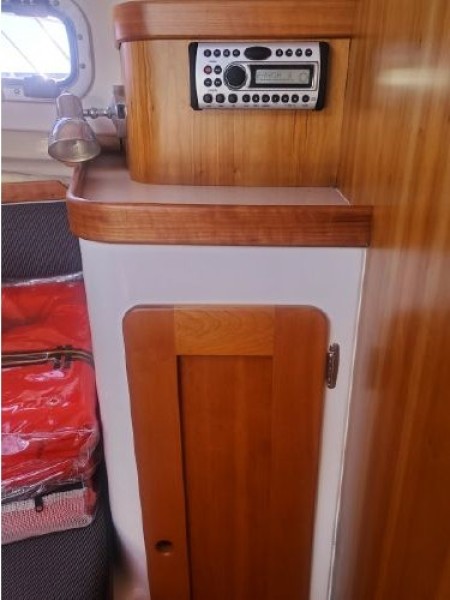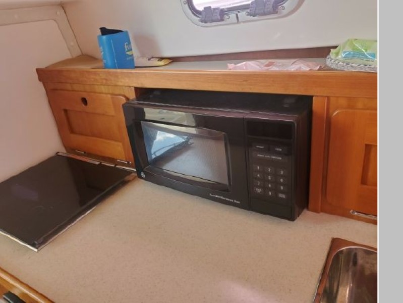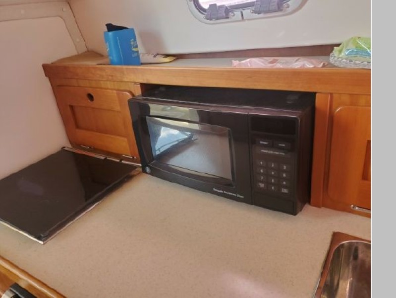The Surfhunter's accommodations include a V-berths forward with storage underneath. Enclosed head with shower & sump pump, a New Jabsco toilet with Y-valve & 15-gallon holding tank; towel rack and clothes hooks & active solar vent . The galley features hot & cold pressure water, S.S. sink with Corian countertop, Refrigerator, Microwave, Butane stove and satin-finish cherry storage cabinet. Ventilation is provided throughout the cabin by is an overhead opening hatch above the v-berth and 4 opening port-lights.