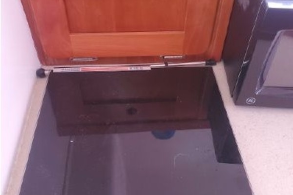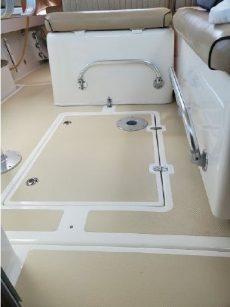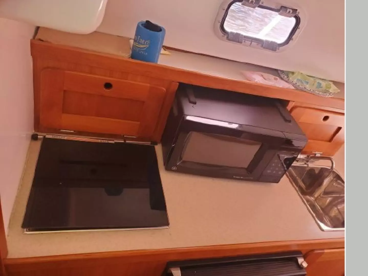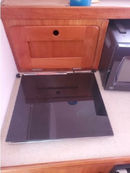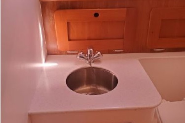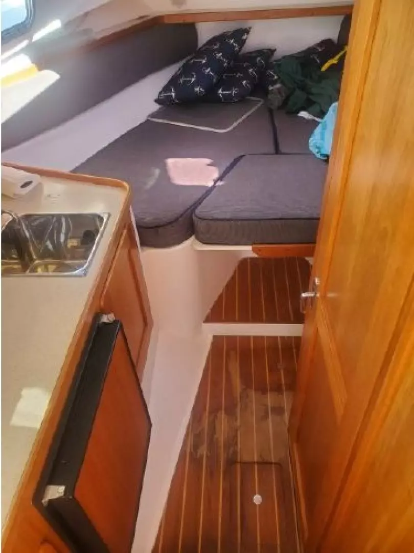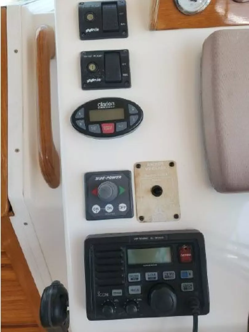 The Surfhunter's accommodations include a V-berths forward with storage underneath. Enclosed head with shower & sump pump, a New Jabsco toilet with Y-valve & 15-gallon holding tank; towel rack and clothes hooks & active solar vent . The galley features hot & cold pressure water, S.S. sink with Corian countertop, Refrigerator, Microwave, Butane stove and satin-finish cherry storage cabinet. Ventilation is provided throughout the cabin by is an overhead opening hatch above the v-berth and 4 opening port-lights.
