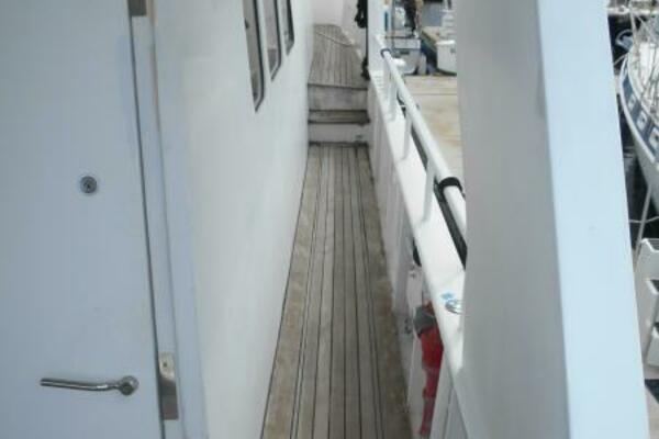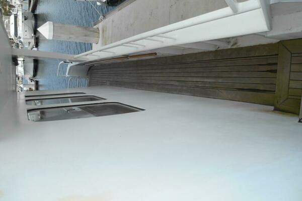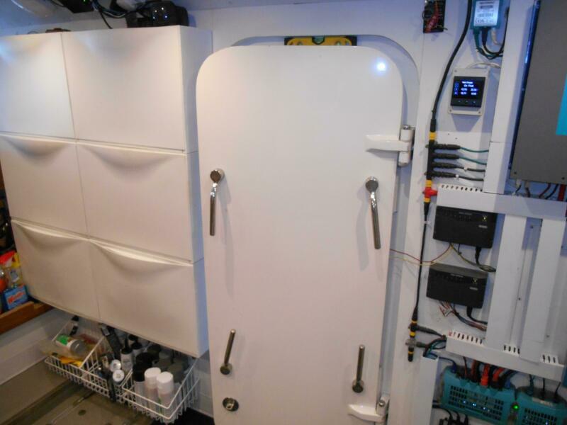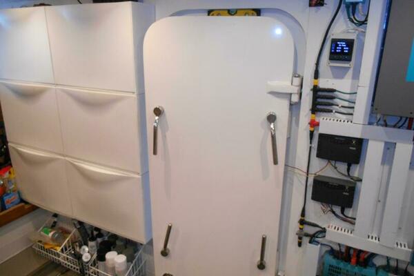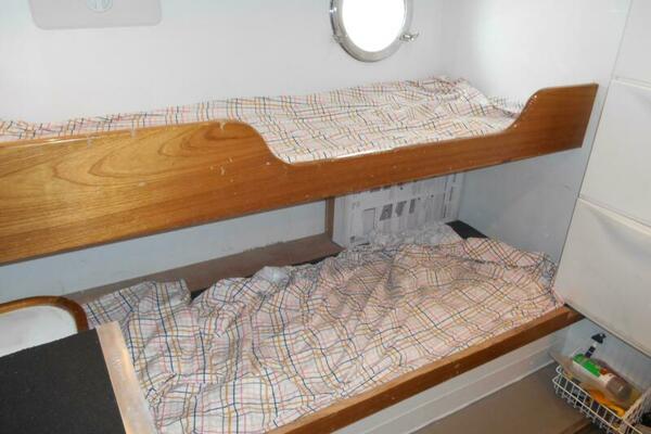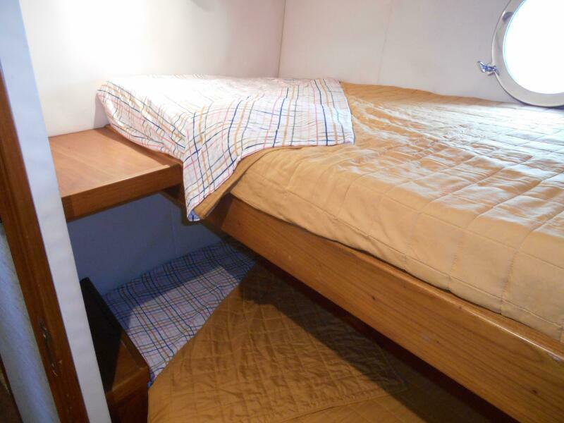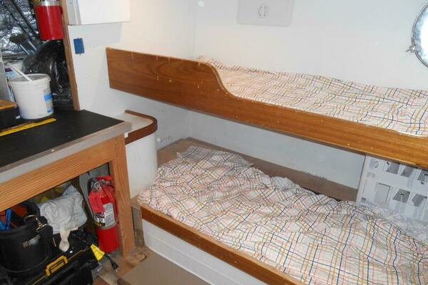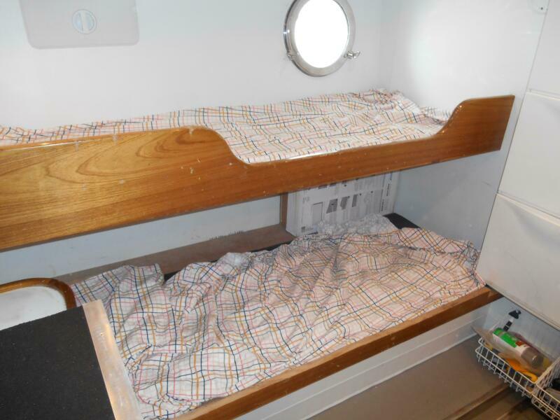 Entering the Lazarette is to Starboard from the aft deck hatch. It is located aft of the engine room and has access to the engine room through a watertight bulkhead door. There are two single berths for crew, or the owner operator can use this as a 4th stateroom.