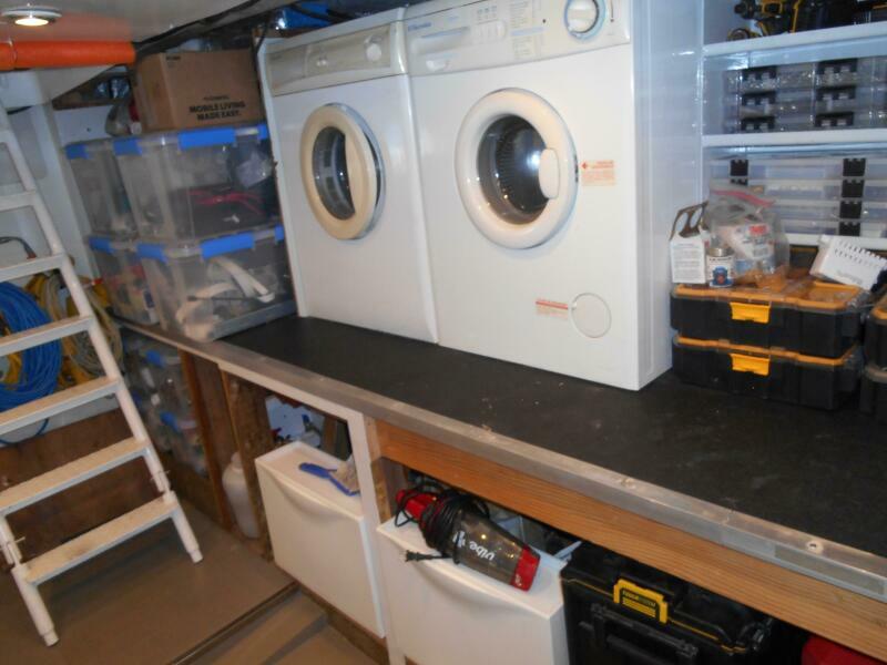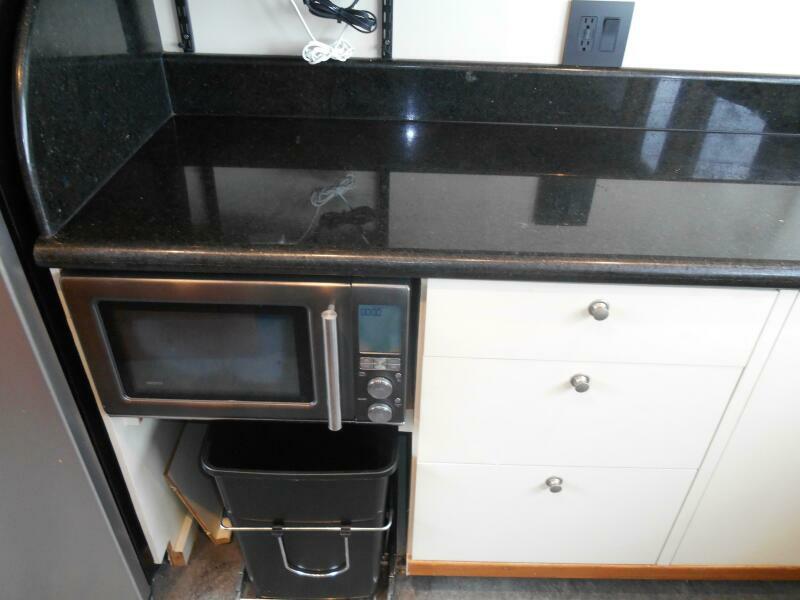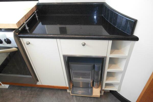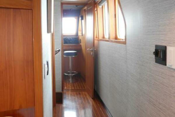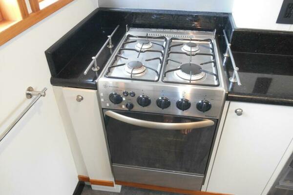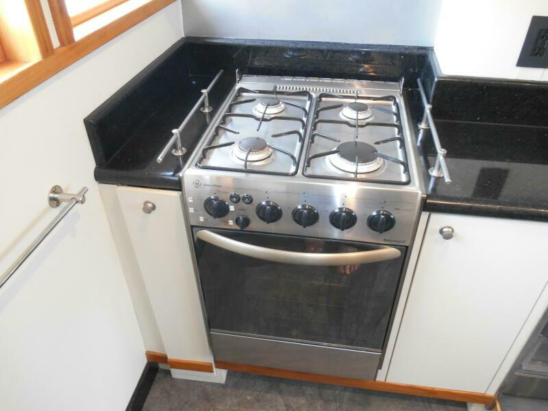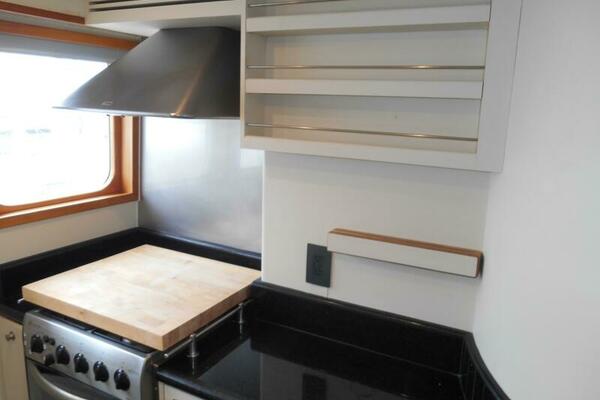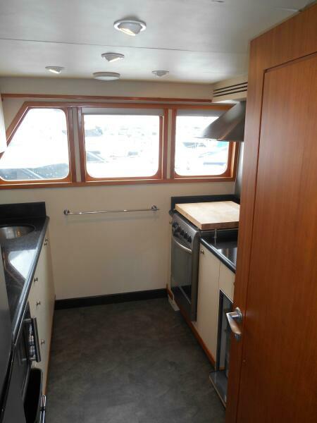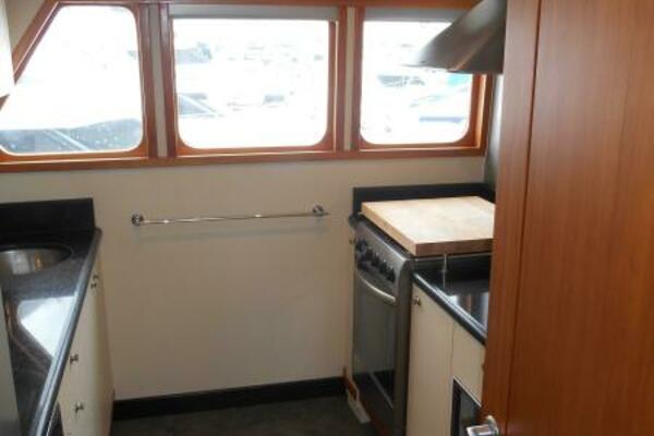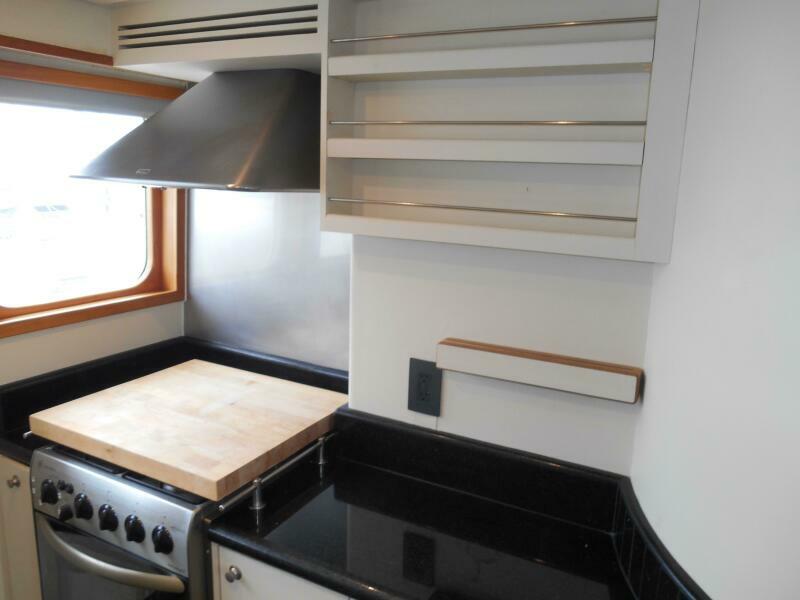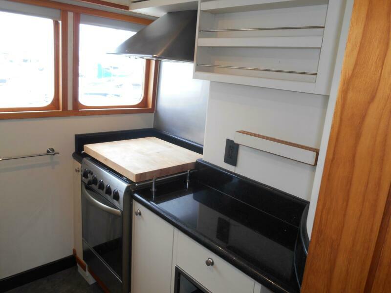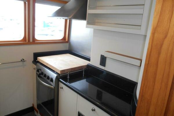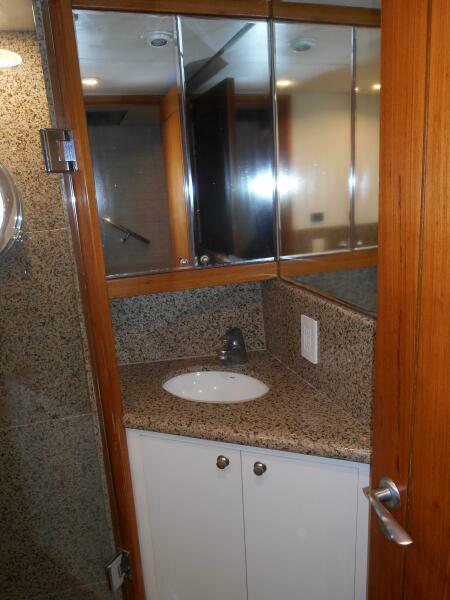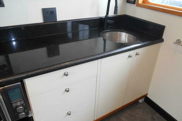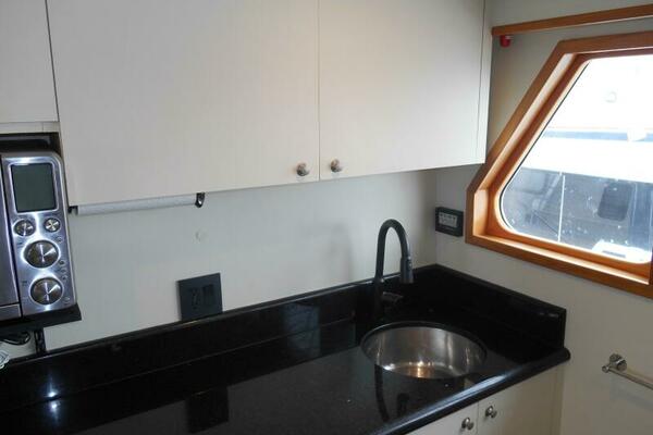 The Galley is forward of the salon located slightly to port of the passageway heading to the pilothouse. It has plenty of storage above and below, large marble counter tops facing both forward and aft. The galley was purposely oriented and designed to serve while underway or at anchor.