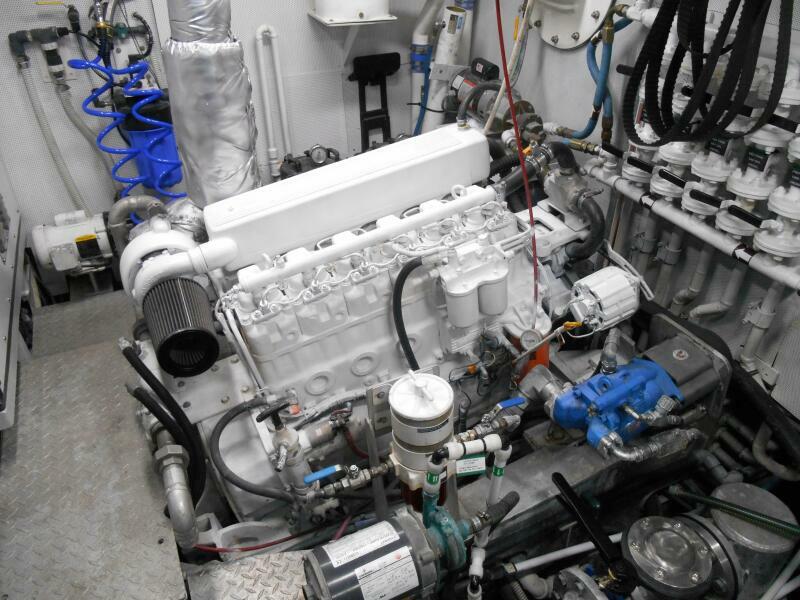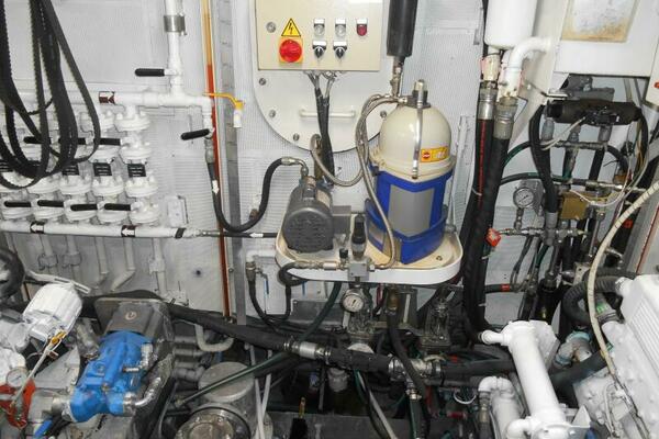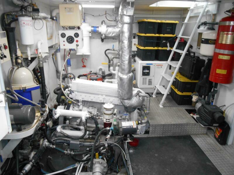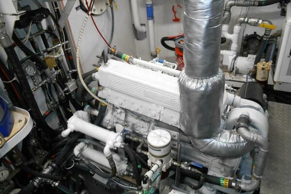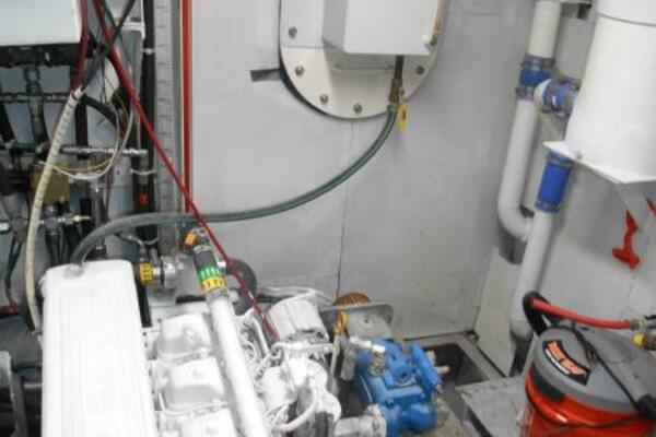 A spacious engine room with stand-up headroom makes easy access to all machinery, pumps, equipment, fuel manifolds and tankage. The fuel tanks are affixed athwartships across the beam of the engine room and are fitted with sight gages and manifolds.