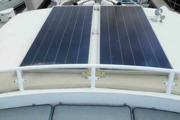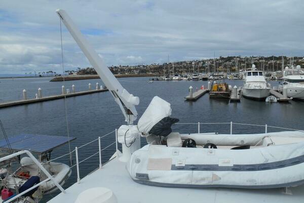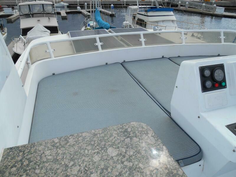 Flybridge is laid out to please the “Sun Worshiper’s” as there is a large sunning pad forward the Flying Bridge consol. A Stainless Sink and storage cabinet is located to Starboard and the propane locker is to Port, with a full-width radar arch overhead. Aft is tender and davit.
