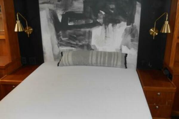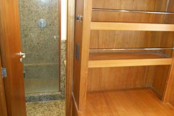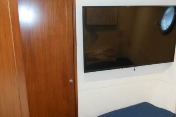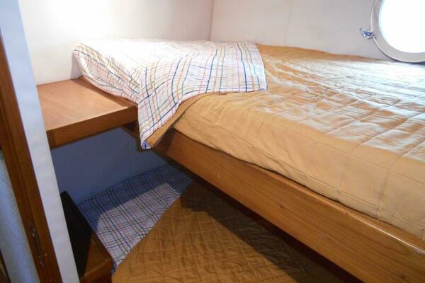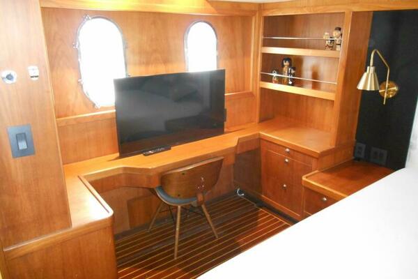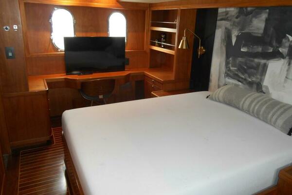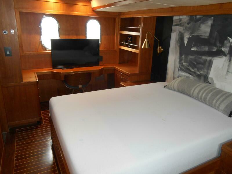 The Full-Beam Master Stateroom is located mid-ship for stability and comfort for the owners while under way. The cabin is surrounded in rich Brazilian Hardwood with built in settee, built in desk and shelving, Island Queen Bed. Large Stainless Steel Port Lights provide ample natural lighting to the stateroom with the closet located to port and en-suite forward to starboard with marble flooring and walls and glass enclosed shower.