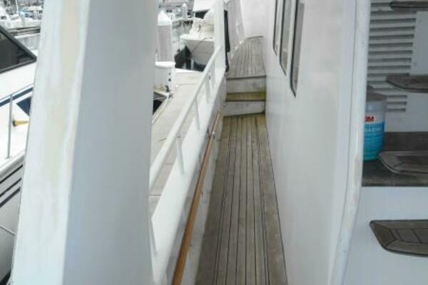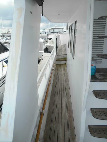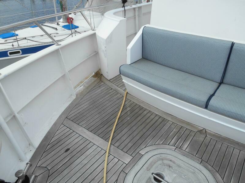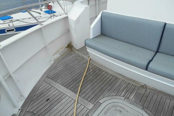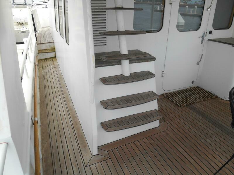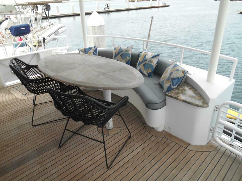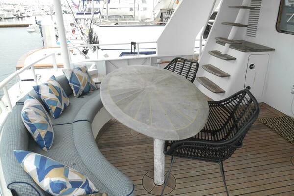 The Covered teak aft deck features circular lounge seating with Brazilian hardwood inlaid oval table. Stairwells port and starboard lead down to the large integrated swim platform with teak overlay. Storage lockers are located to Port and Starboard of the Salon entrance door while the stairway to the flybridge is to port. Engine room access is to Starboard through a watertight door or through a large starboard deck hatch.