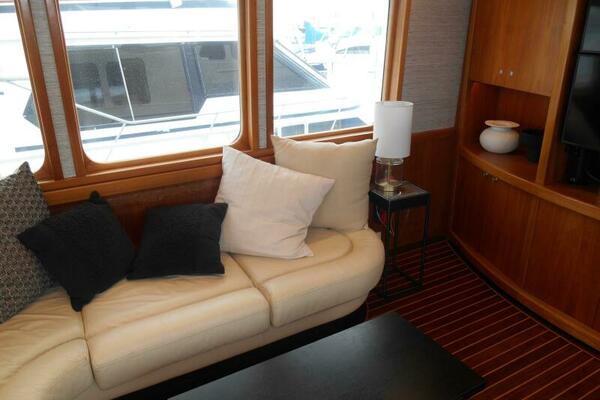 Upon entering from the aft deck, the first impression is of the open and spacious feeling one gets from the large windows trimmed in wood framing. The inviting rich leather sofas located port / starboard providing a comfortable relaxing environment for entertaining. Forward end of the salon is the rich Brazilian wood entertainment center.