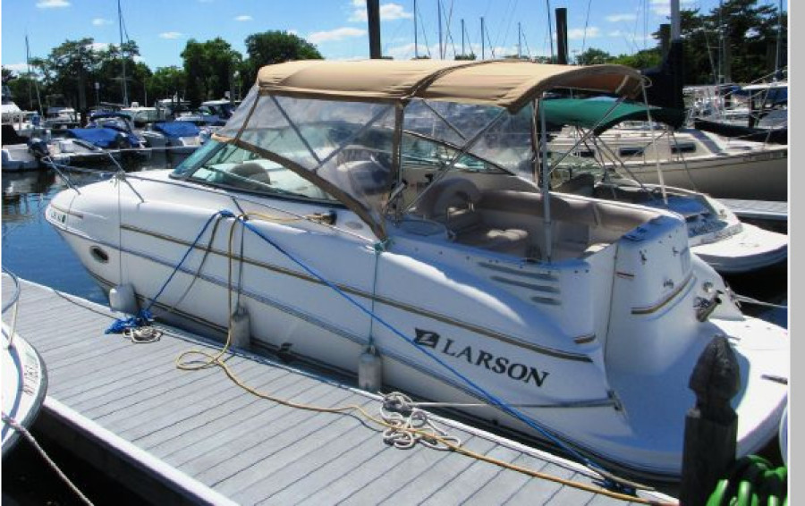 This is a 2005 model LARSON CABRIO 274 Mid-Cabin Express Cruiser. This exceptionally popular model was produced by LARSON BOATS of Pulaski, WI for the 2002 through 2011 model years . She's powered by a VOLVO-PENTA 5.7GI that's rated at 320 HP; this motor will propel her about a 39-knot "top end" and gives an economical cruise at about 26-knots with a 12.5 GPH fuel burn as well.