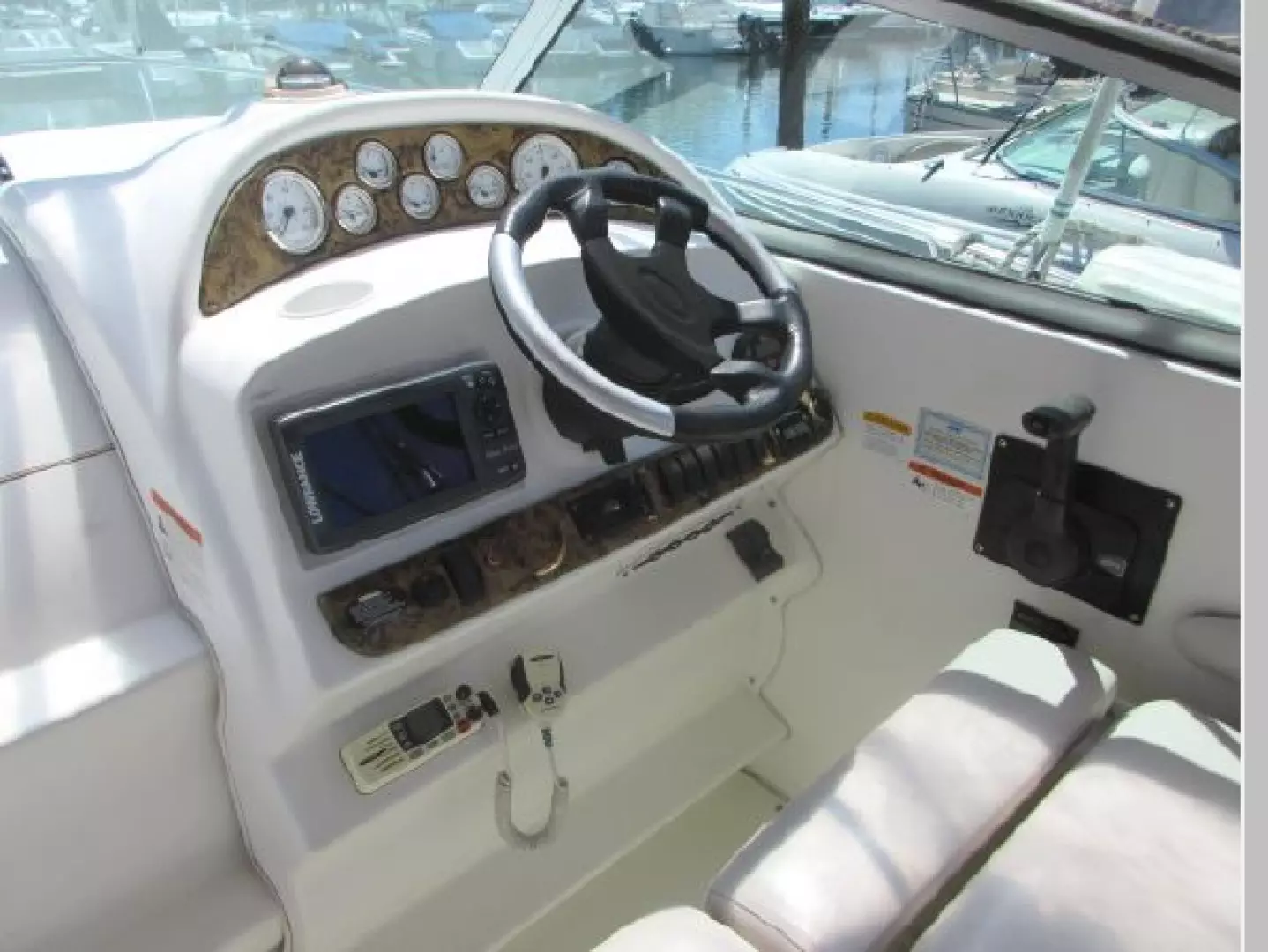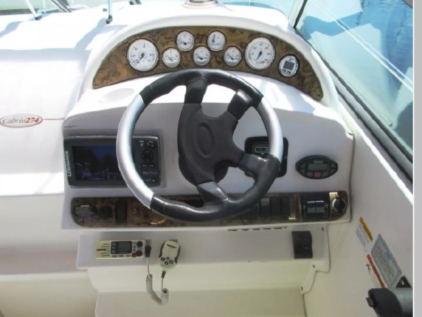 Engine instrumentation w/ "black on white" gauges: Boat Speed (in MPH) - Oil Temperature - Fuel Quantity - Alternator Output / Voltage - Trim Tab Indicator - Engine Coolant Temperature - Tachometer