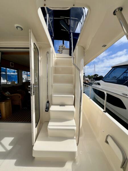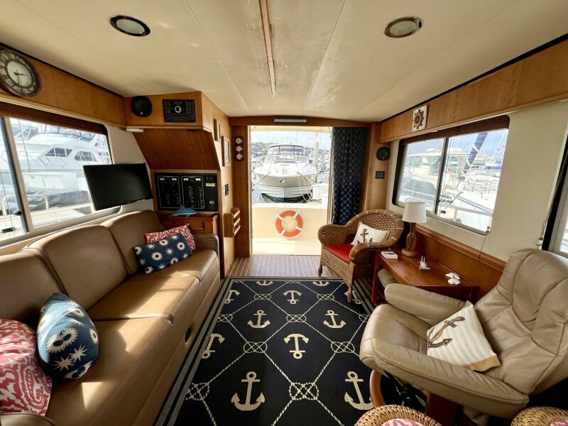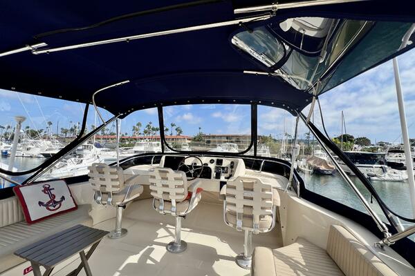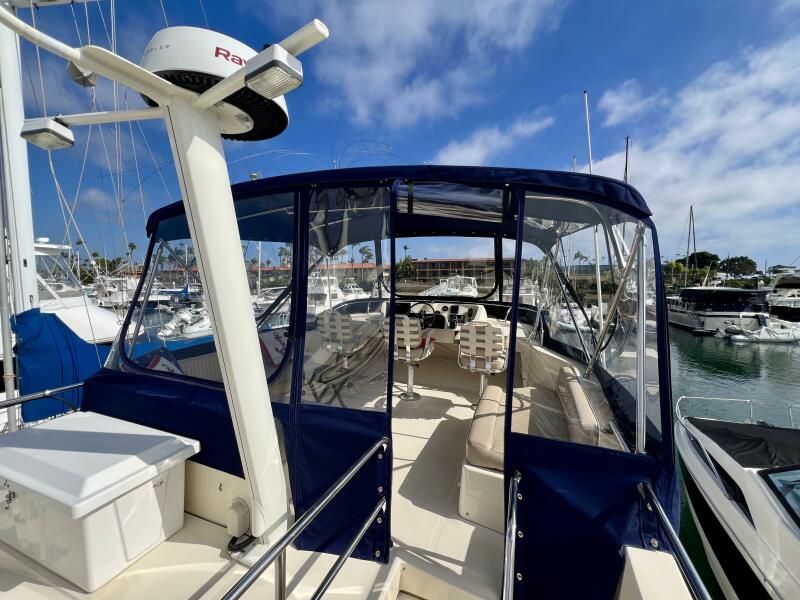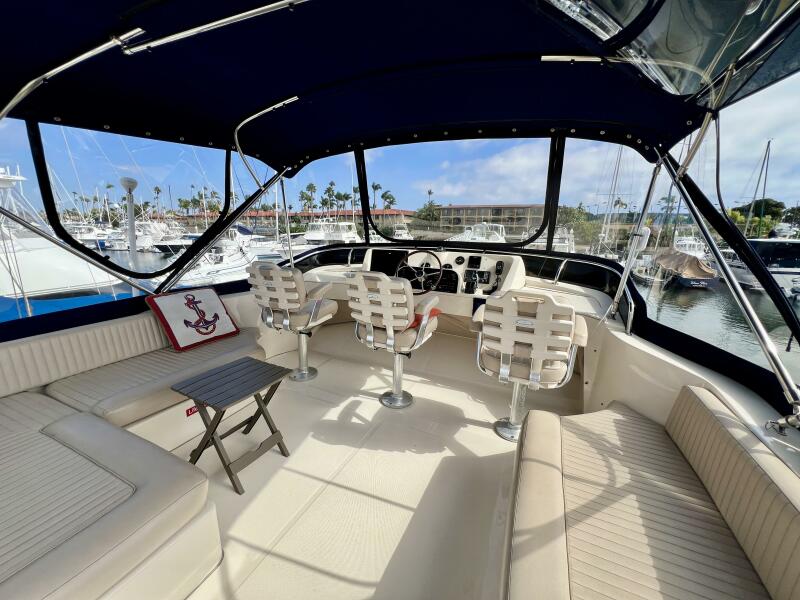 Expansive and newly enclosed flybridge with abundant seating and entertainment space.