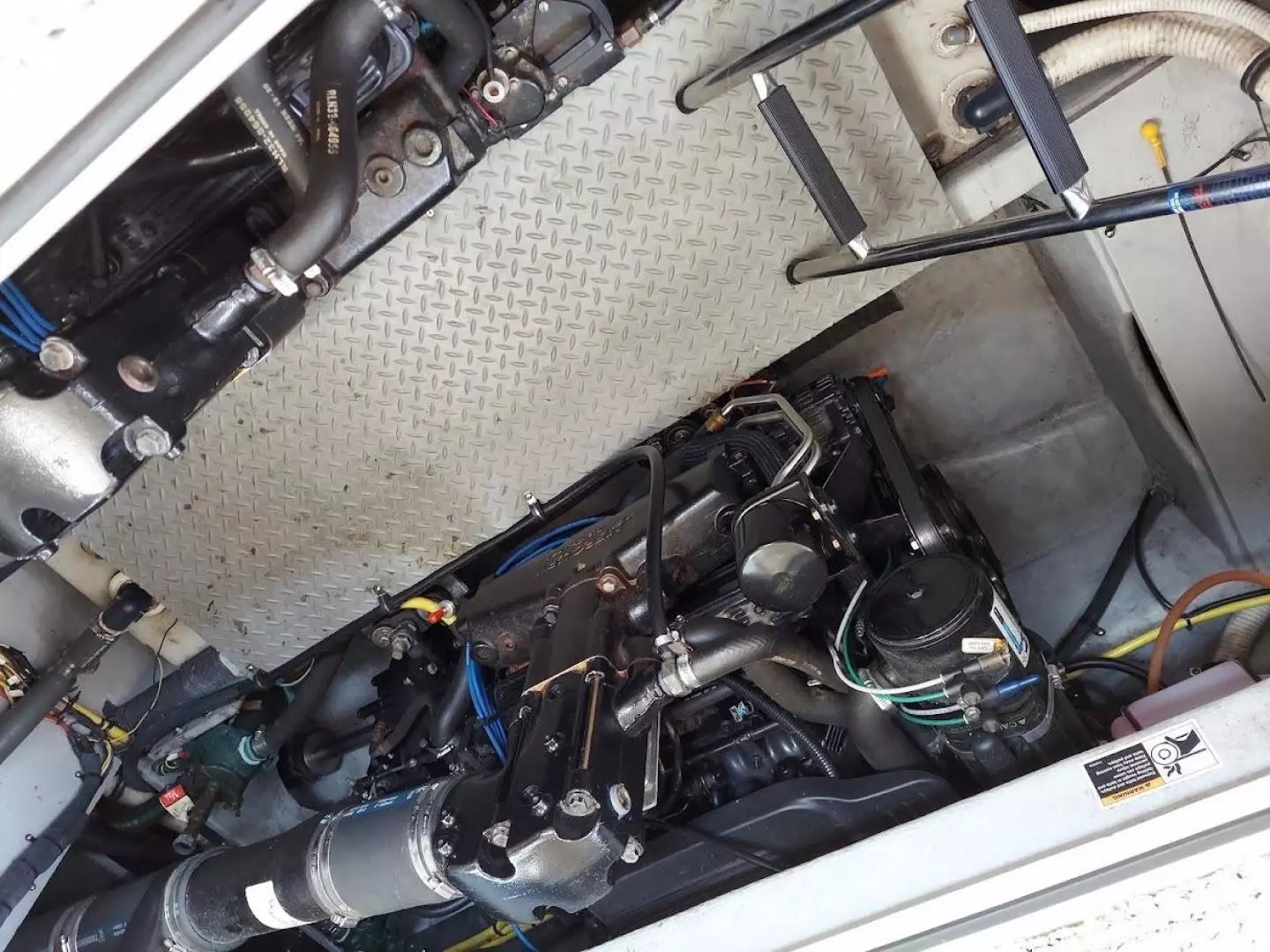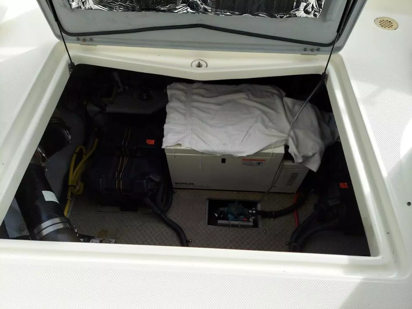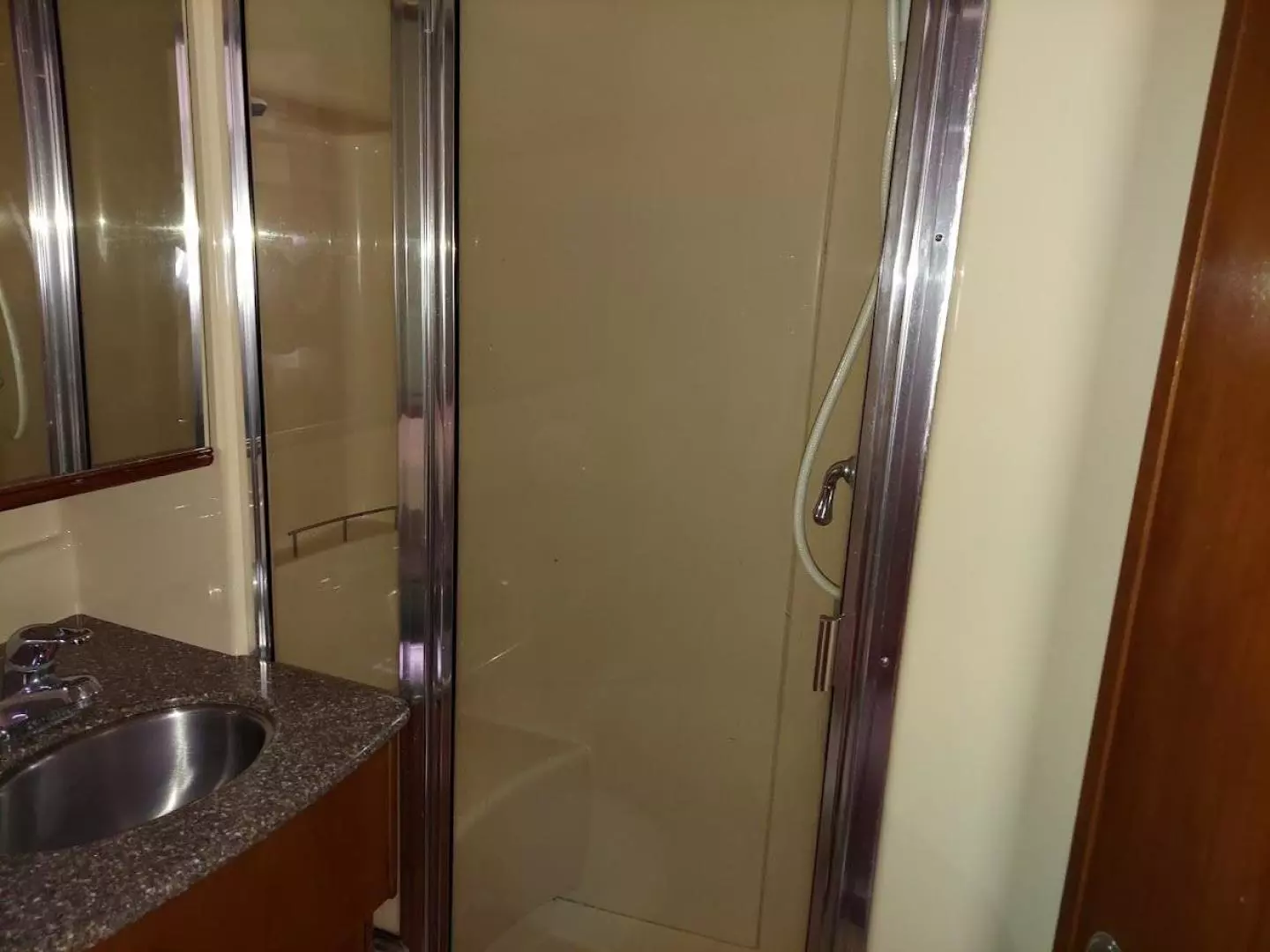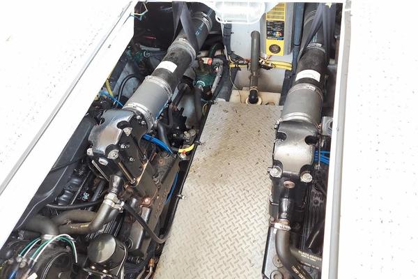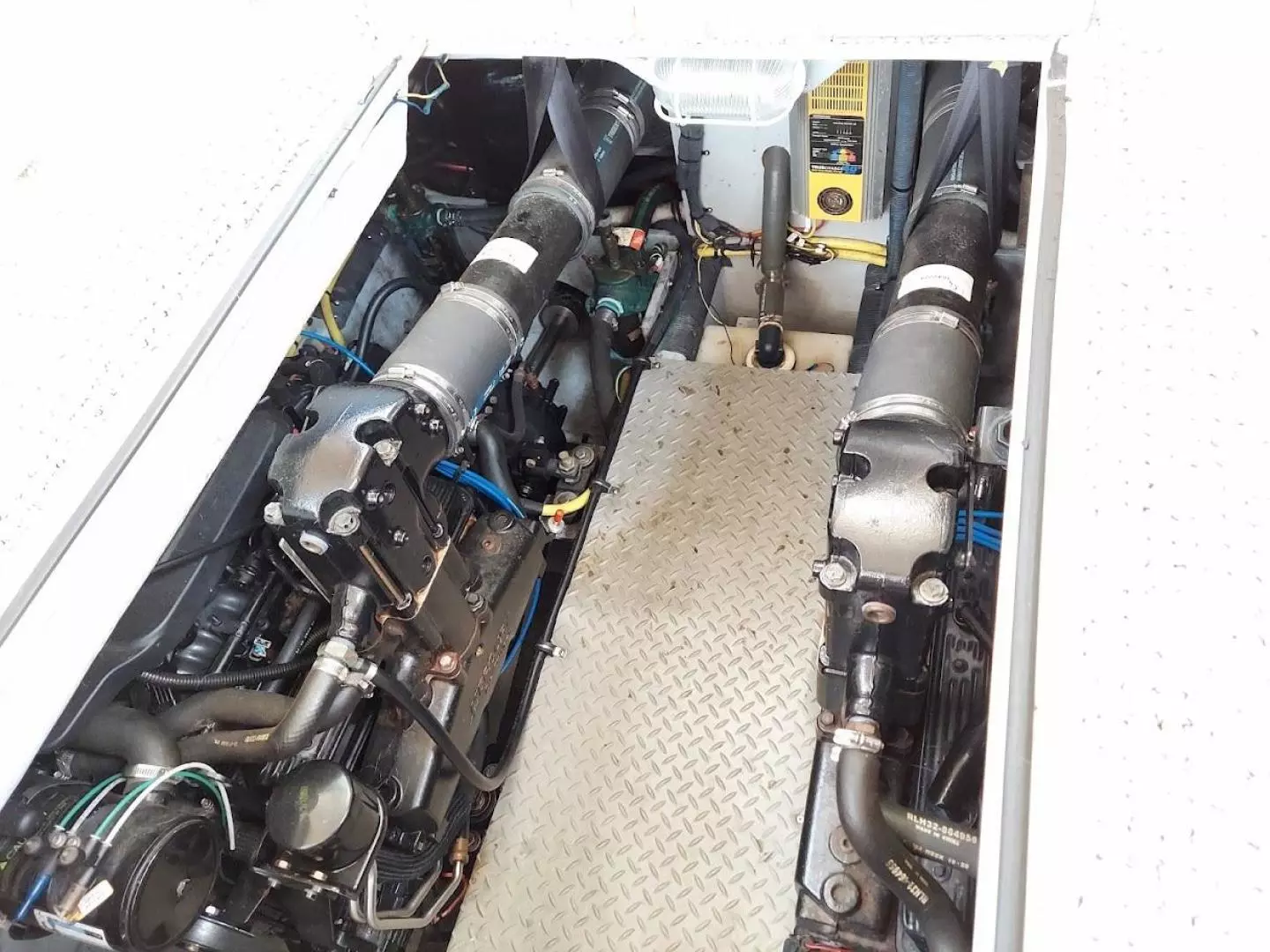 Forward you have the master stateroom with a centerline queen bed, hanging lockers and a ventilation hatch. Aft to starboard is the enclosed head with separate stall shower. Aft again is the second stateroom with twin single berths Up a couple of steps to the port side galley area with all the amenities and ample counter, cabinet and drawer space. Up a step to the salon area with an L-shaped Settee to starboard and a settee to port. Aft to port is the TV with entertainment center. Out to the cockpit area with a transom door to the swim platform. Up the stairwell to the flybridge with the helm to starboard, L-shaped settee to port and a U-shaped seating with a table to starboard.