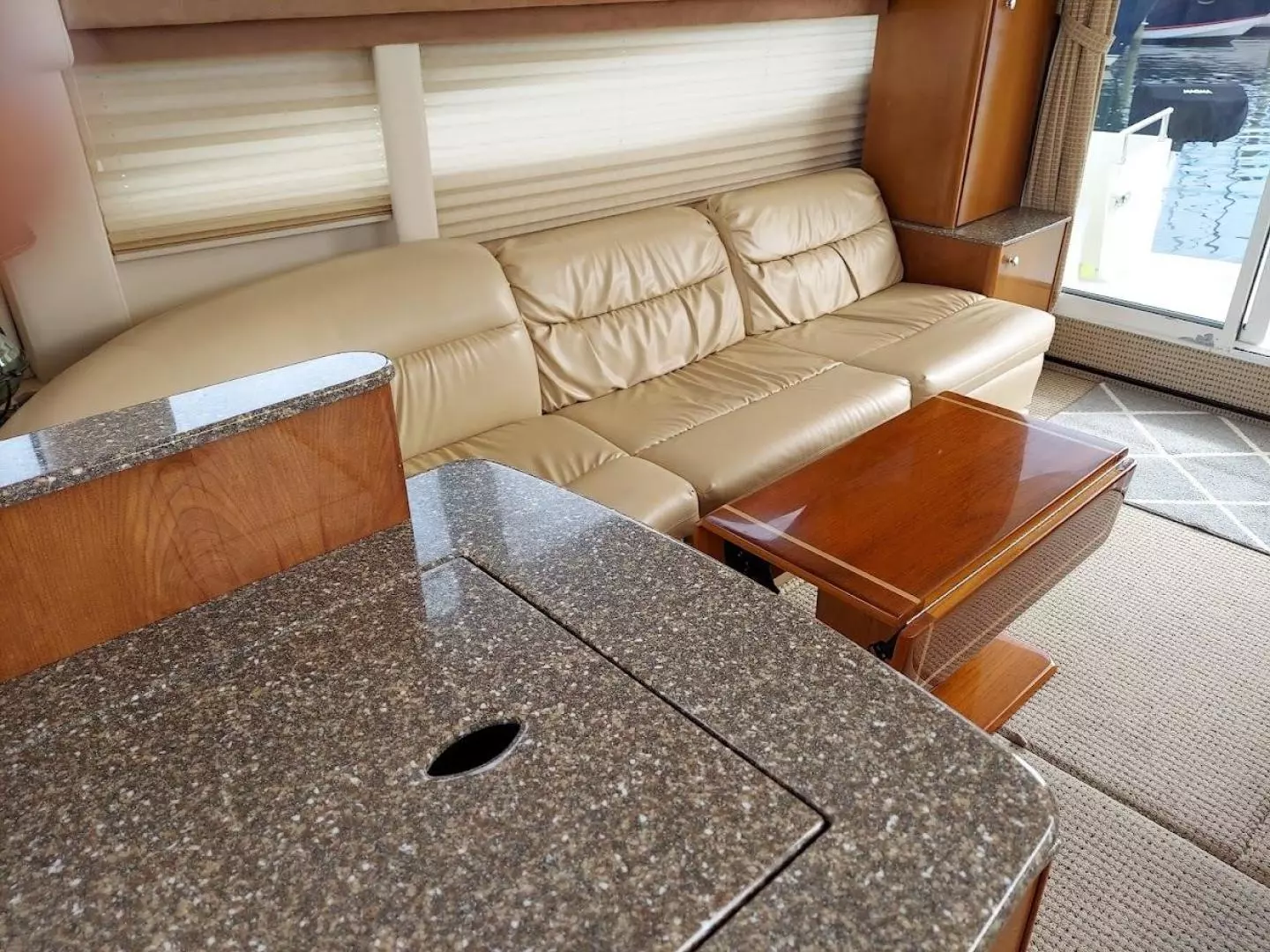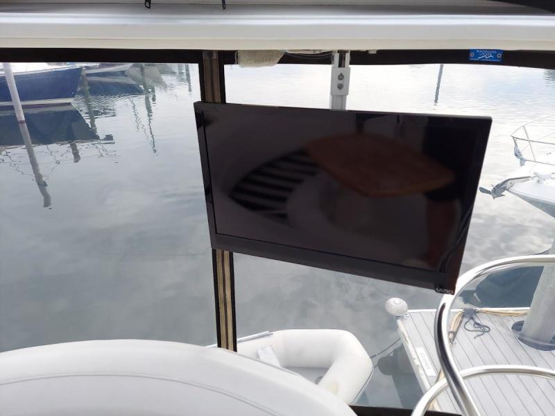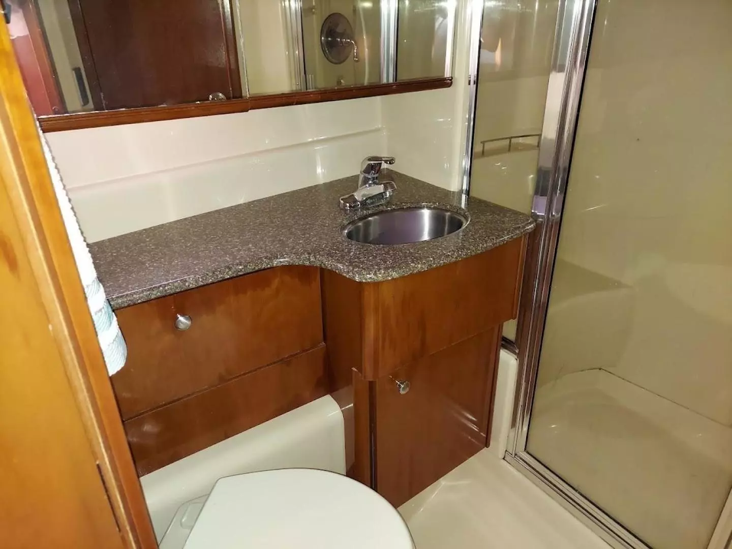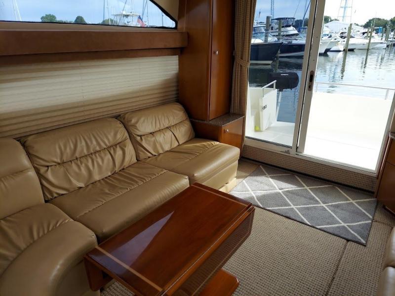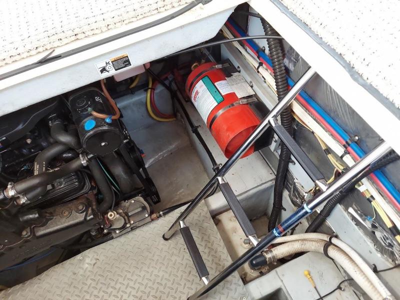 Forward you have the master stateroom with a centerline queen bed, hanging lockers and a ventilation hatch. Aft to starboard is the enclosed head with separate stall shower. Aft again is the second stateroom with twin single berths Up a couple of steps to the port side galley area with all the amenities and ample counter, cabinet and drawer space. Up a step to the salon area with an L-shaped Settee to starboard and a settee to port. Aft to port is the TV with entertainment center. Out to the cockpit area with a transom door to the swim platform. Up the stairwell to the flybridge with the helm to starboard, L-shaped settee to port and a U-shaped seating with a table to starboard.