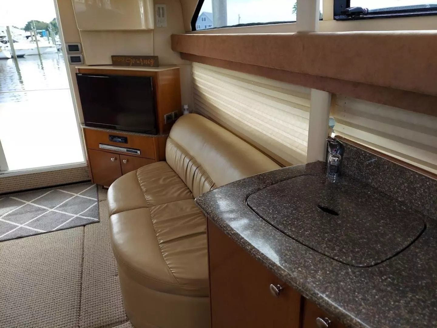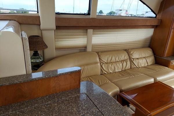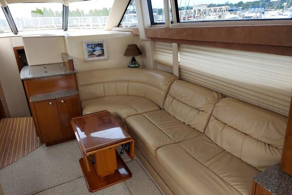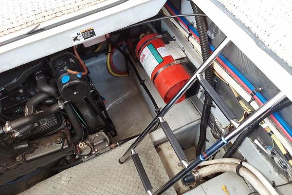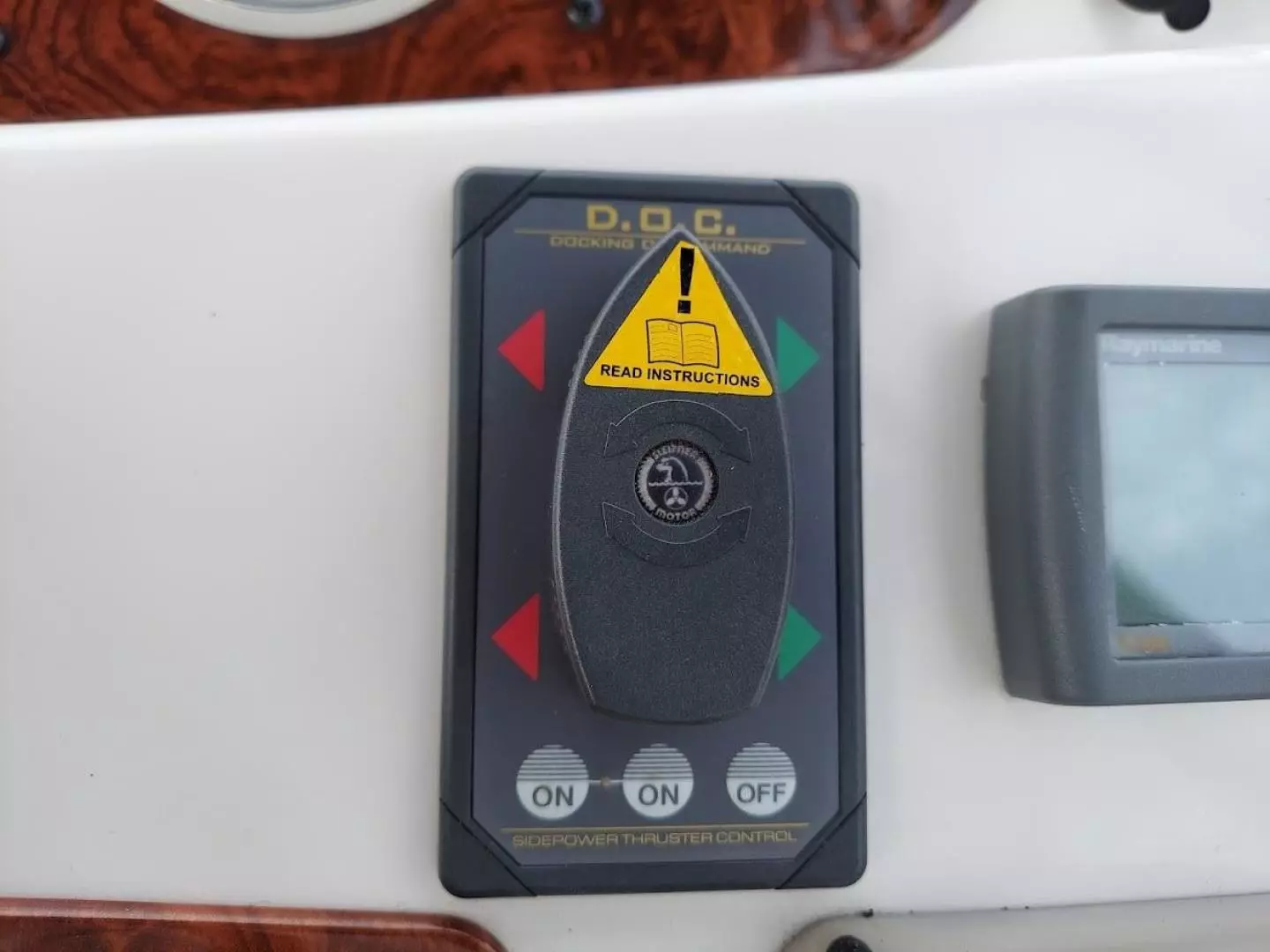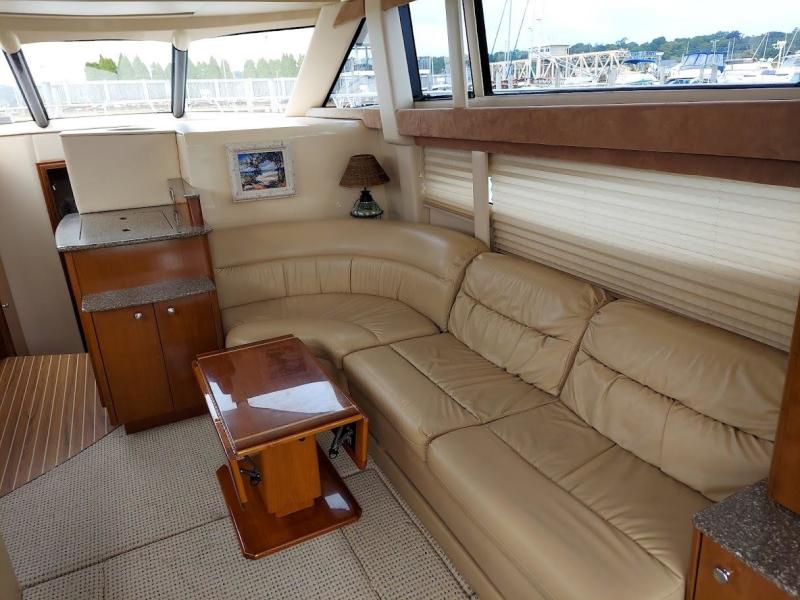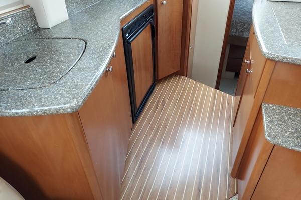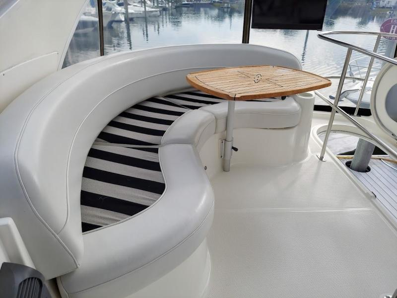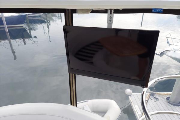 Forward you have the master stateroom with a centerline queen bed, hanging lockers and a ventilation hatch. Aft to starboard is the enclosed head with separate stall shower. Aft again is the second stateroom with twin single berths Up a couple of steps to the port side galley area with all the amenities and ample counter, cabinet and drawer space. Up a step to the salon area with an L-shaped Settee to starboard and a settee to port. Aft to port is the TV with entertainment center. Out to the cockpit area with a transom door to the swim platform. Up the stairwell to the flybridge with the helm to starboard, L-shaped settee to port and a U-shaped seating with a table to starboard.