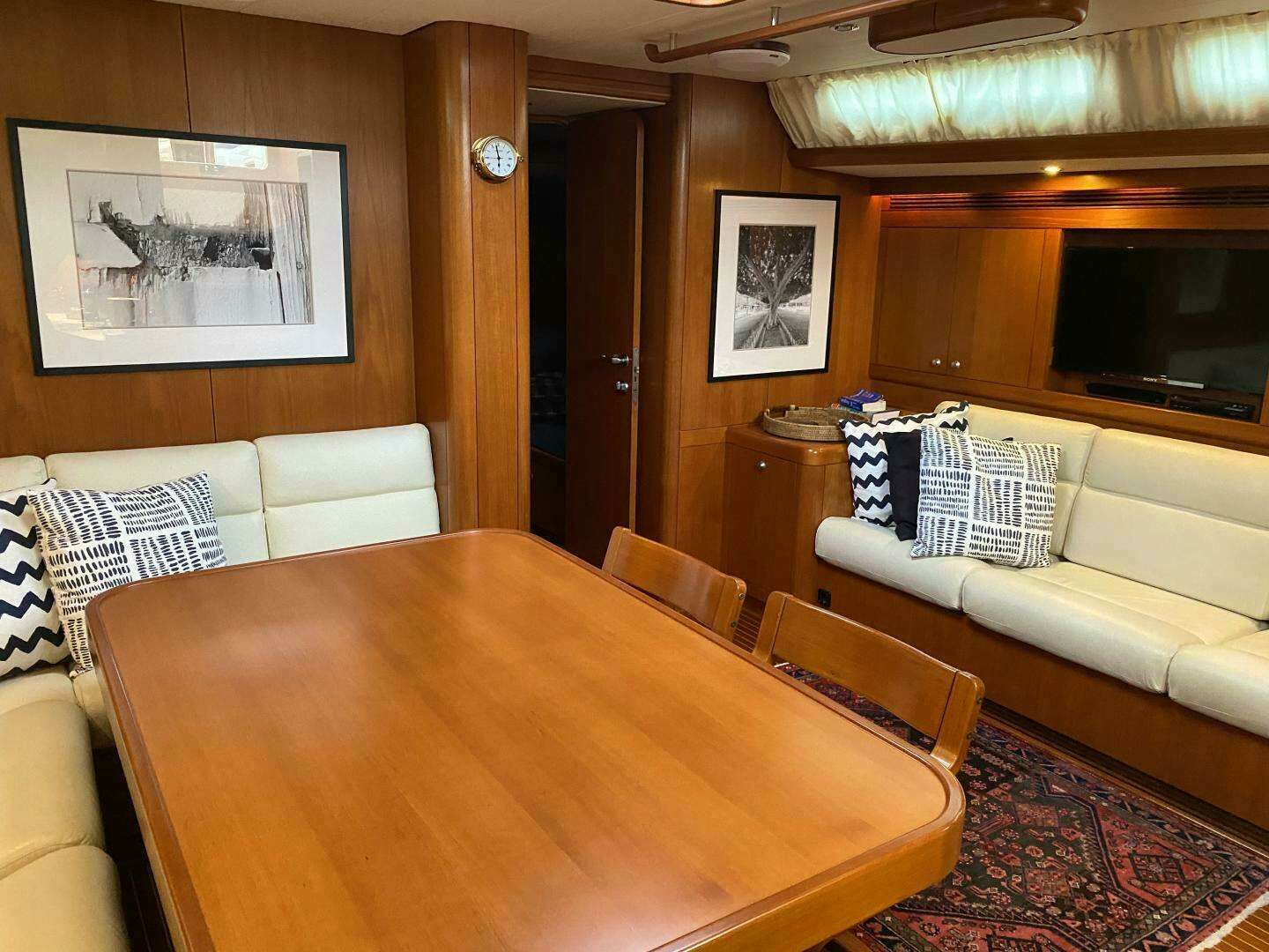 Midships full beam with comfortable L-shaped seating area to portside with wooden table and two armchairs, a sofa to starboard side and navigation area/chart table.