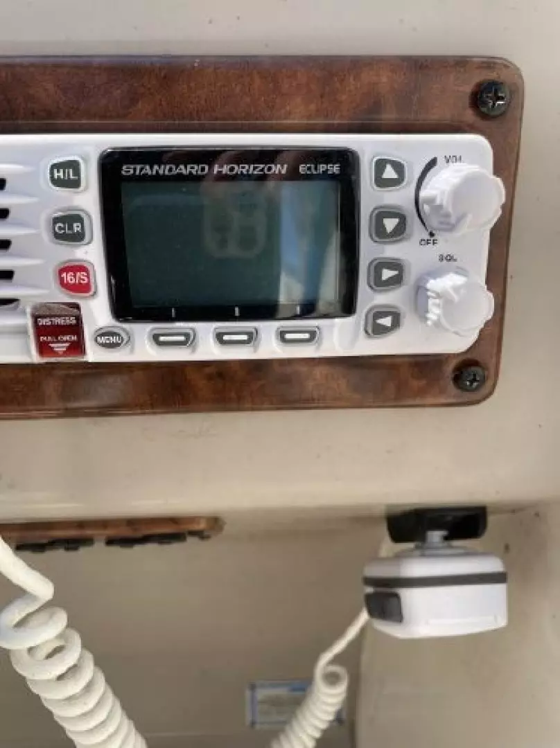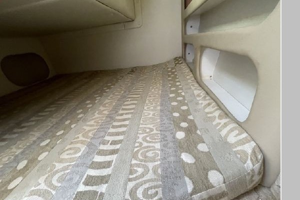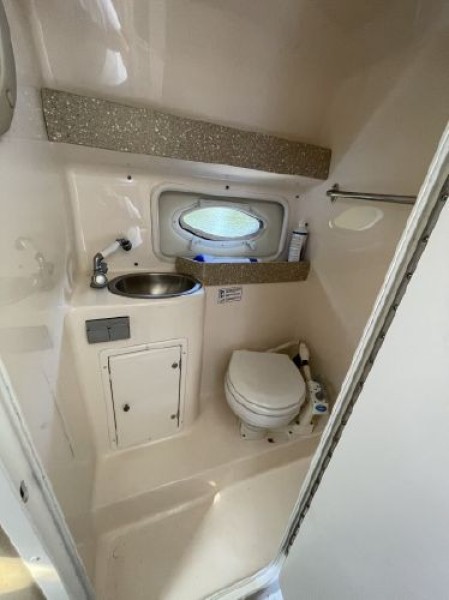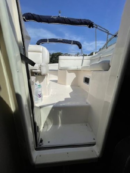 This pocket cruiser is very well equipped for overnights, weekends or extended time aboard. A couple or small family will enjoy not only the space on deck but the room she offers below. The forward dinette converts easily to create a double berth and she has a huge berth aft tucked under the bridge deck. Full galley, enclosed head, generator with air-conditioning etc. On deck, she has a nice cockpit with seating and transom door to swim platform, plus additional seating opposite the helm seat on the bridge deck.