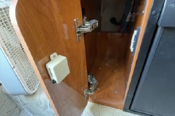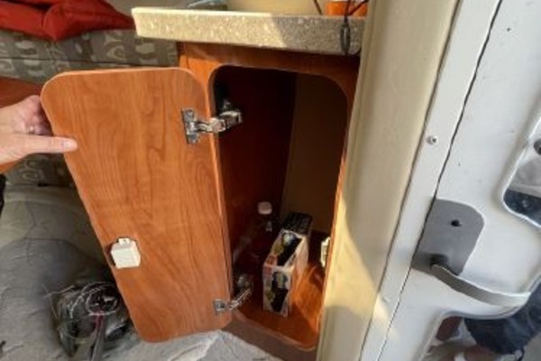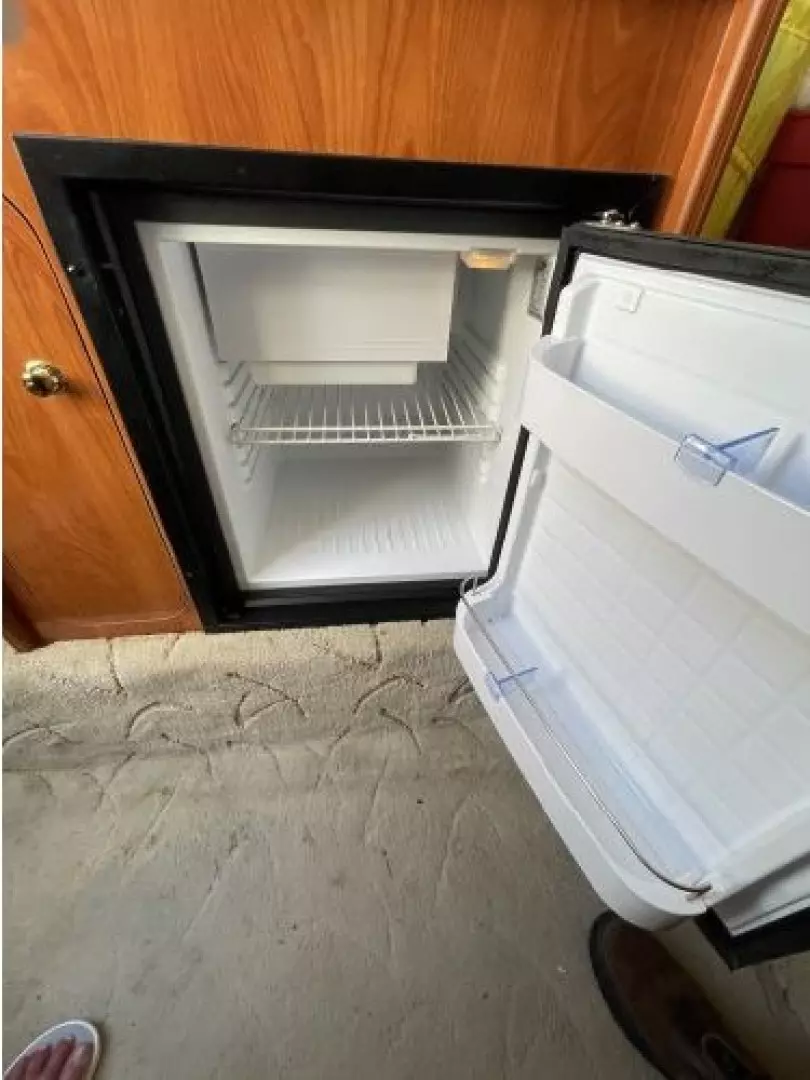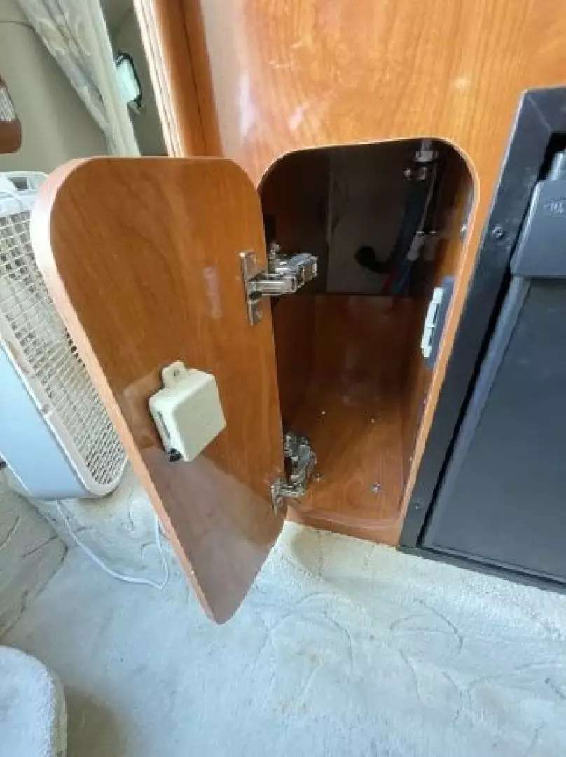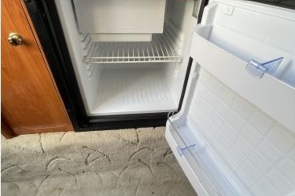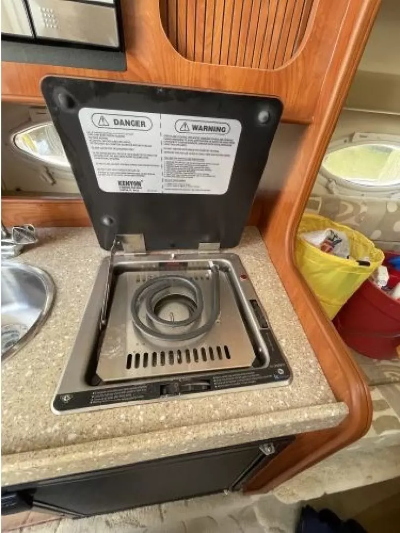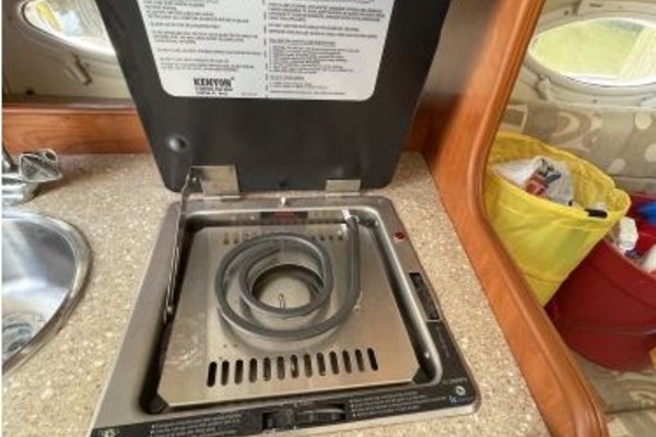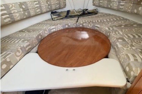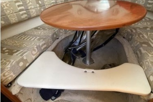 Starting forward is the V-shaped dinette with round center table. The table drops and there is a filler to make into a large double berth. Aft of the dinette, along the starboard side, there is a locker with TV cabinet above. Next is her enclosed head with vanity, sink, toilet. All fiberglass head is perfect for the telephone shower. On the port side is her well equipped galley followed by another locker and access to the aft berth. She has opening ports all around including in the aft berth area and a large hatch overhead for excellent ventilation and light. Her cushions and carpet are of a neutral color pallet.