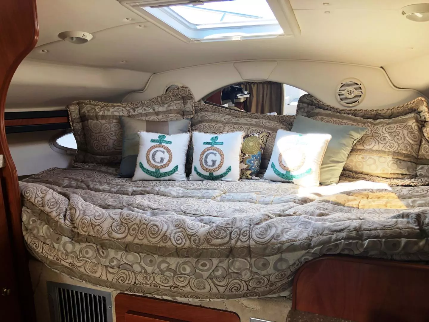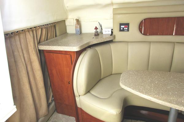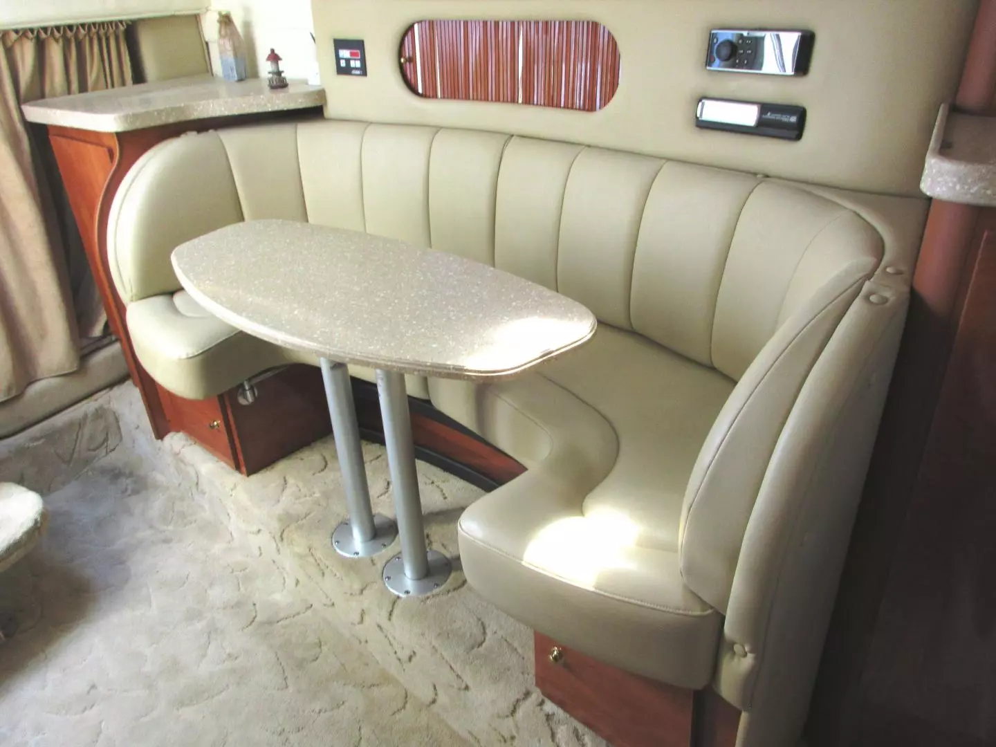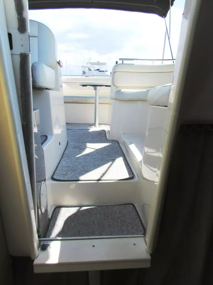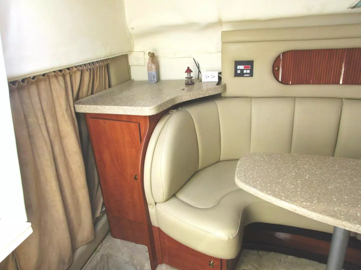 The RINKER 320 Fiesta Vee has an Express Mid-Cabin layout. The Fore / Master Cabin berth is forward and has a privacy curtain. The Head is at the base of the Companionway, starboard side. The Galley is just forward & to starboard. The Salon settee is to port along with the dining table & opposite the Galley & the Head. Then entrance to the Mid-Cabin is aft & to port.