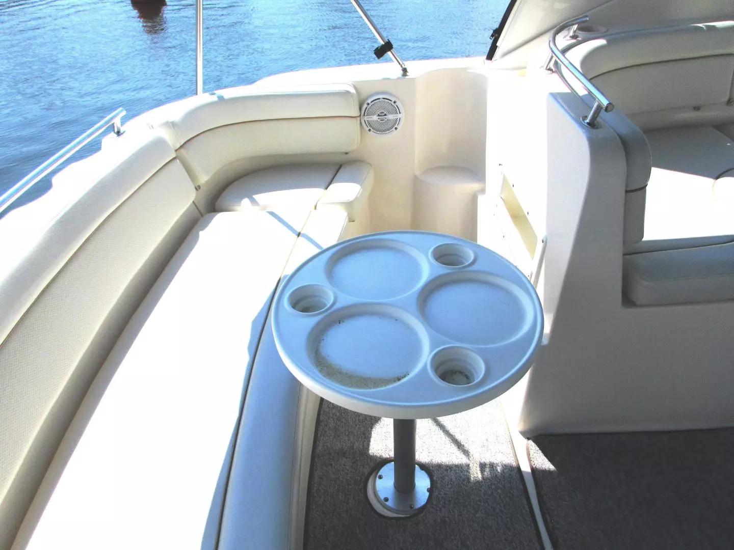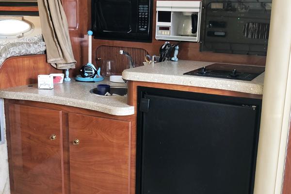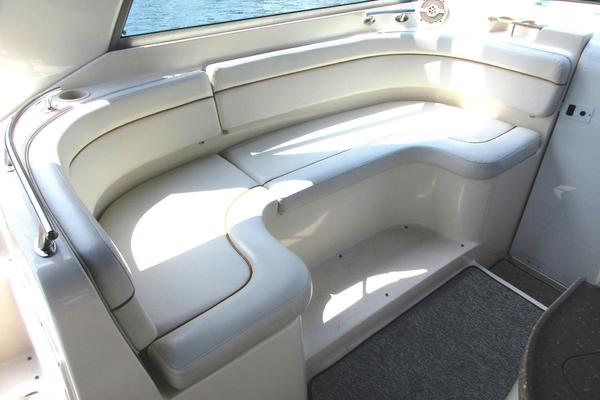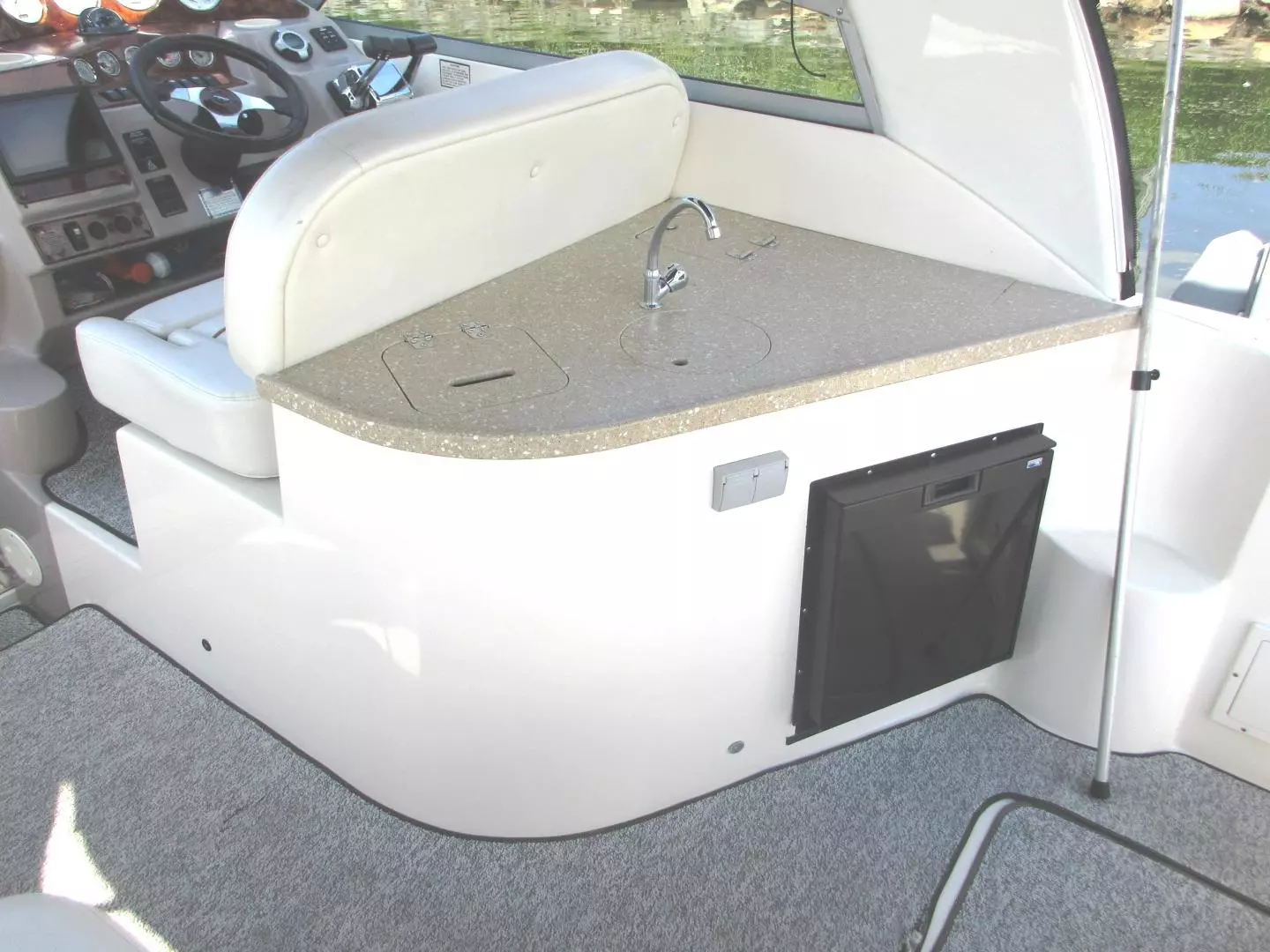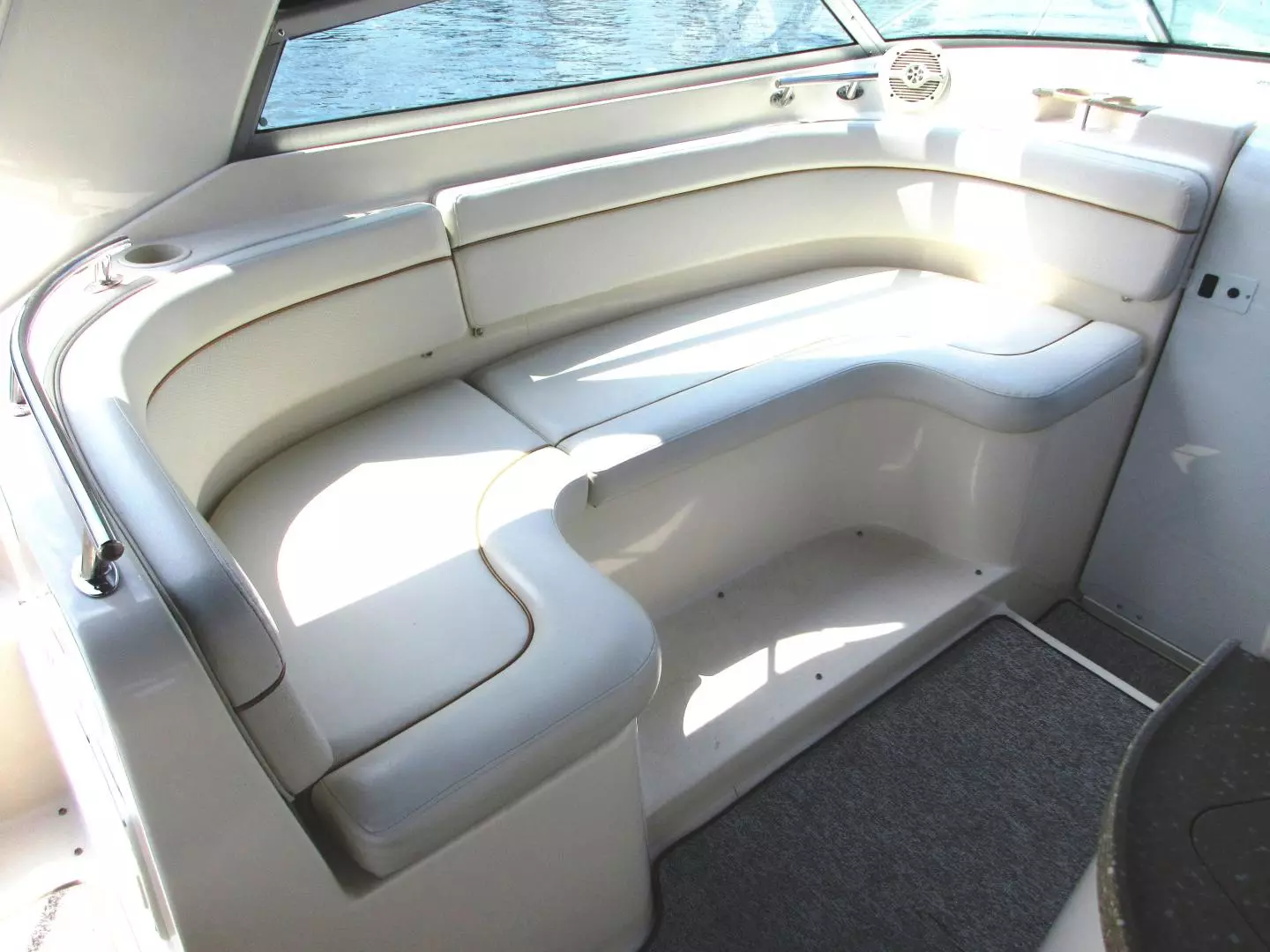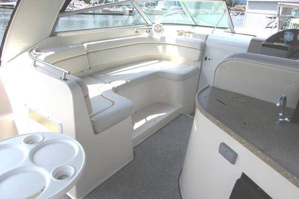 The RINKER 320 Fiesta Vee has an Express Mid-Cabin layout. The Fore / Master Cabin berth is forward and has a privacy curtain. The Head is at the base of the Companionway, starboard side. The Galley is just forward & to starboard. The Salon settee is to port along with the dining table & opposite the Galley & the Head. Then entrance to the Mid-Cabin is aft & to port.