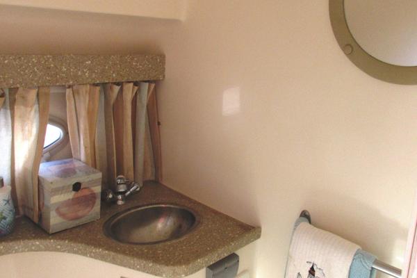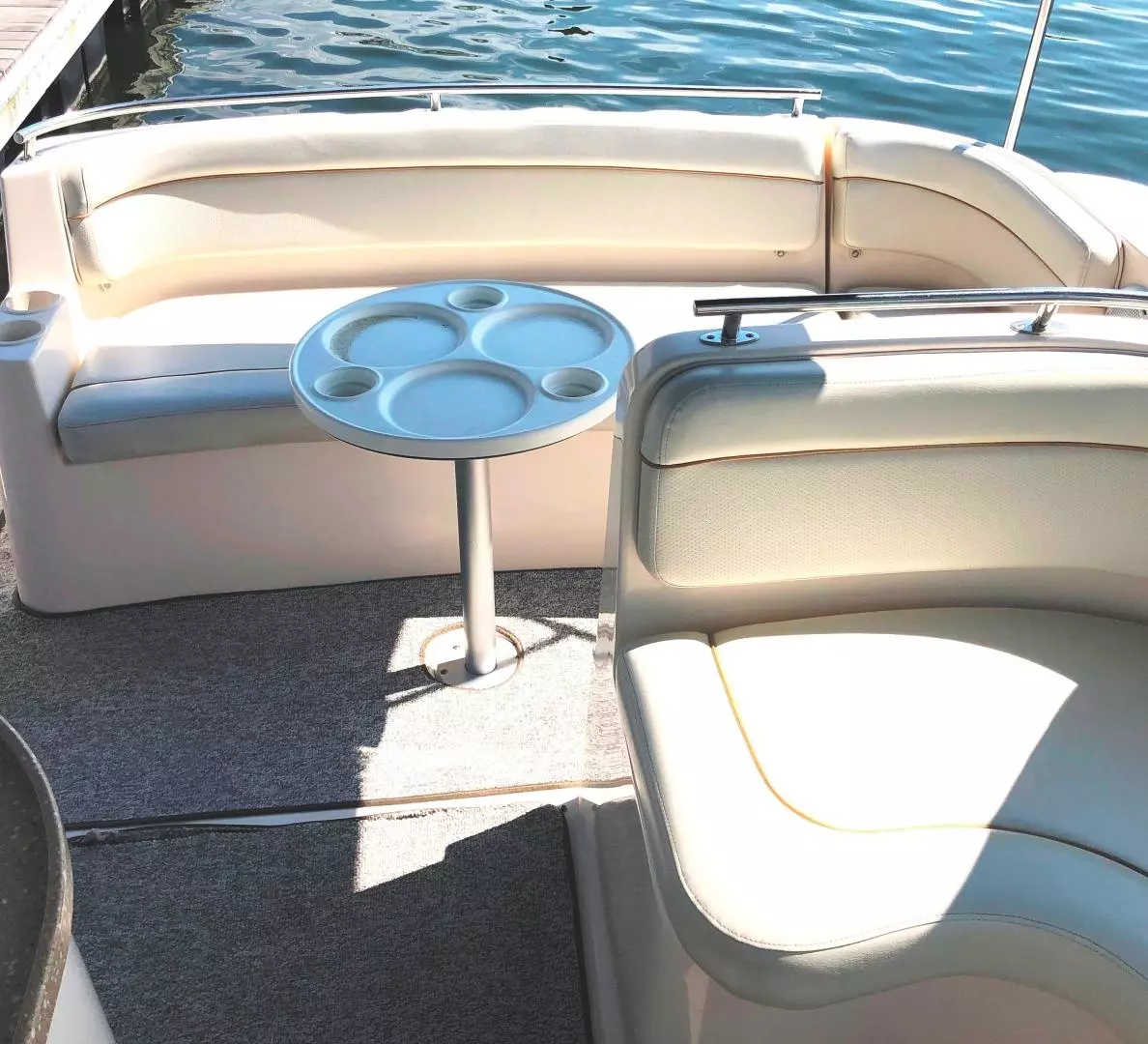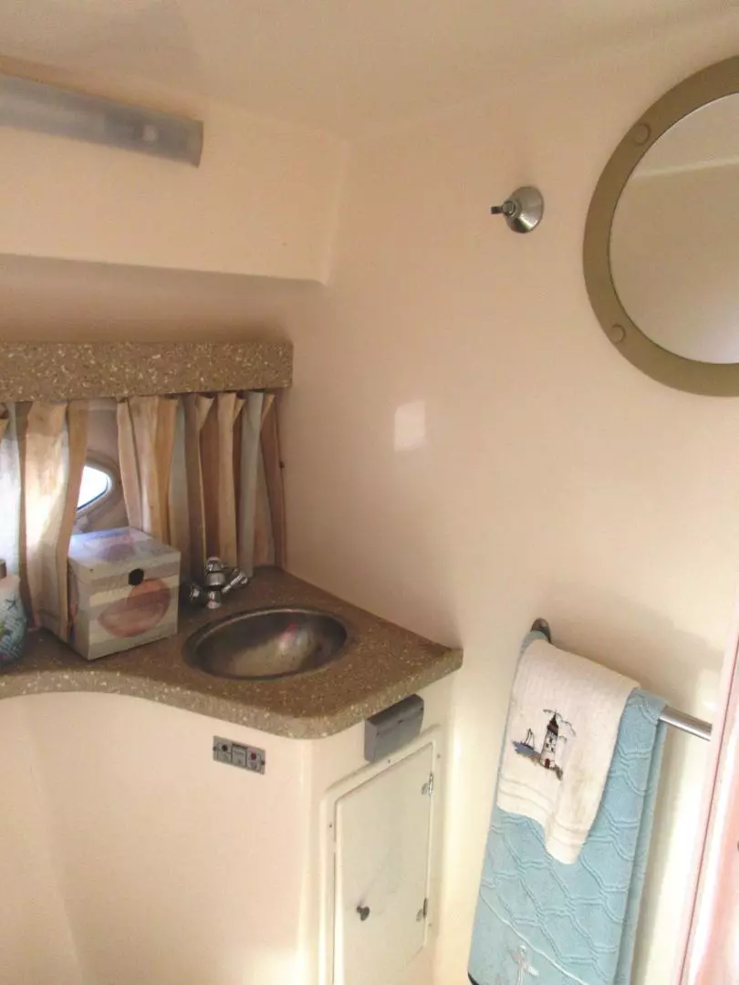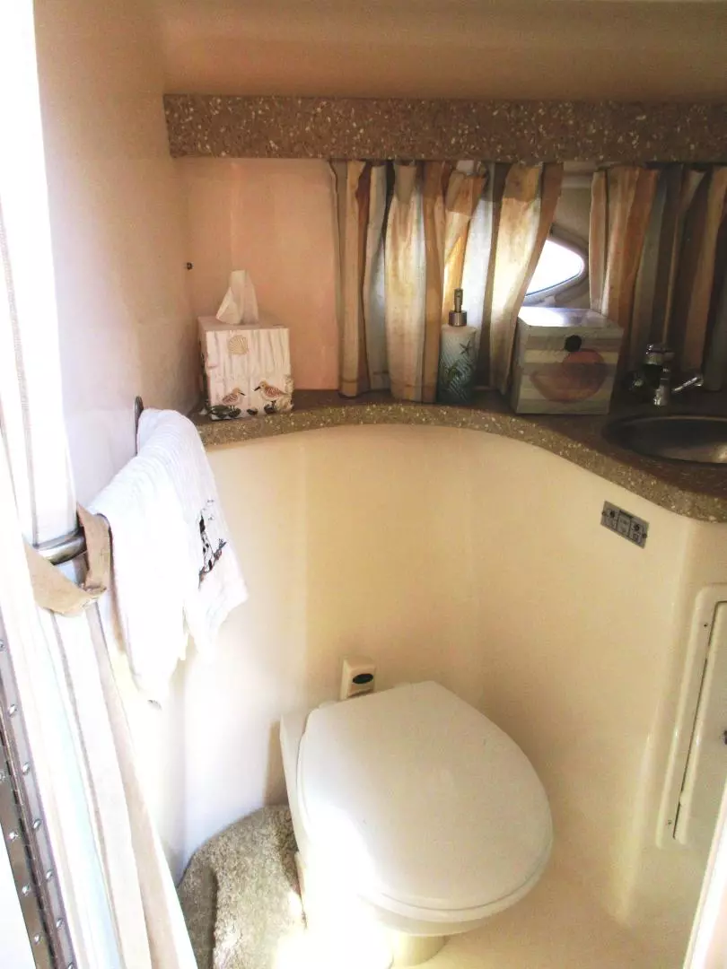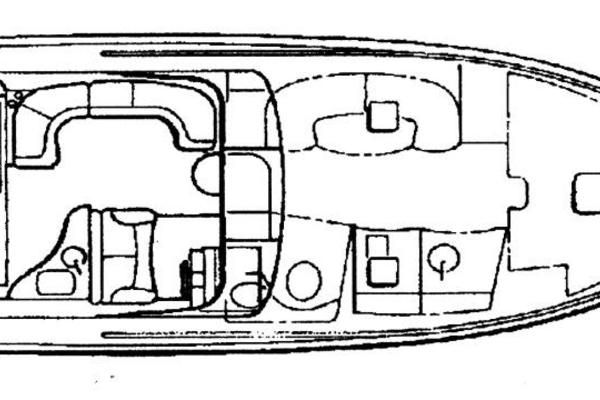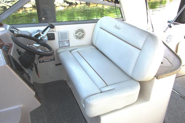 The RINKER 320 Fiesta Vee has an Express Mid-Cabin layout. The Fore / Master Cabin berth is forward and has a privacy curtain. The Head is at the base of the Companionway, starboard side. The Galley is just forward & to starboard. The Salon settee is to port along with the dining table & opposite the Galley & the Head. Then entrance to the Mid-Cabin is aft & to port.