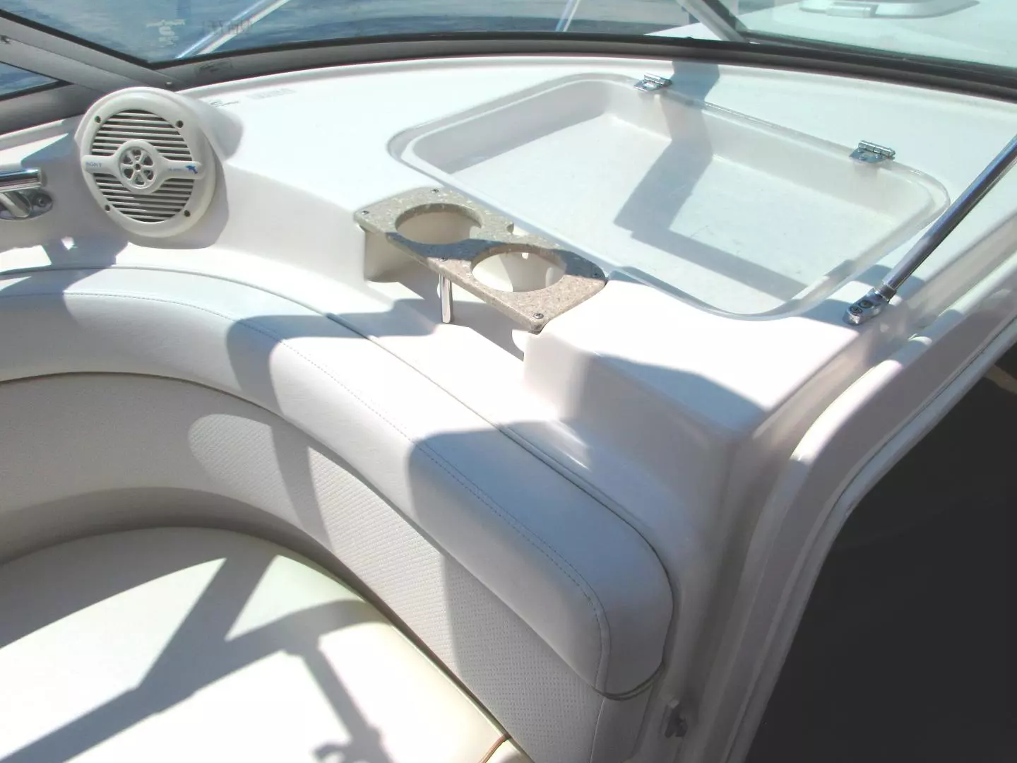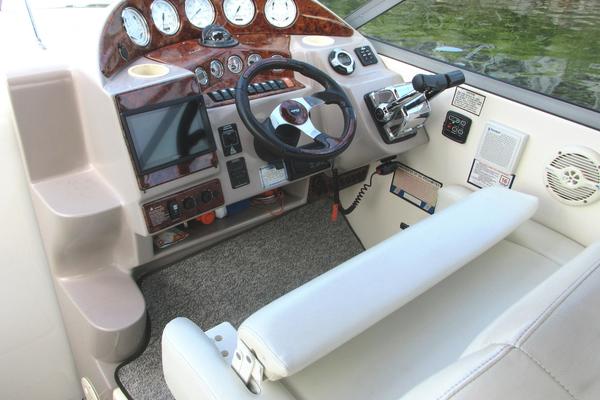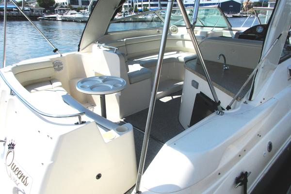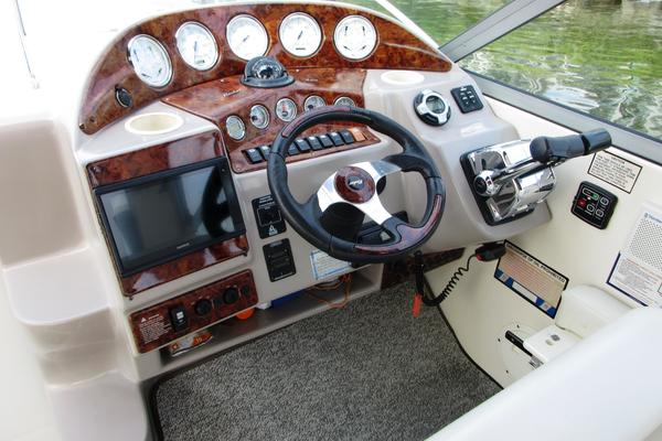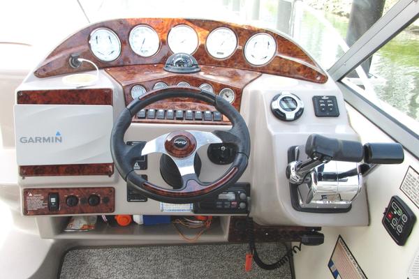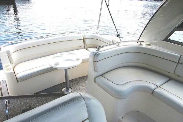 The RINKER 320 Fiesta Vee is powered by twin VOLVO-PENTA 270 OSI-EF V-8 fresh-water cooled (FWC) inboard gas engines that are rated at 270 HP at 4,800 RPM. These engines will provide a cruise speed of some 22 knots at 3200-3400 RPM and a "top end" of approximately 40 knots at Wide Open Throttle (WOT). At cruise speeds, the fuel burn is approximate 17 USG per hour & that gives an approximate range of some 225 miles.