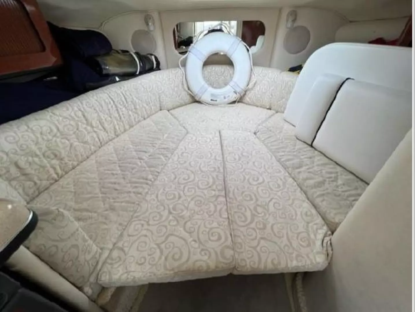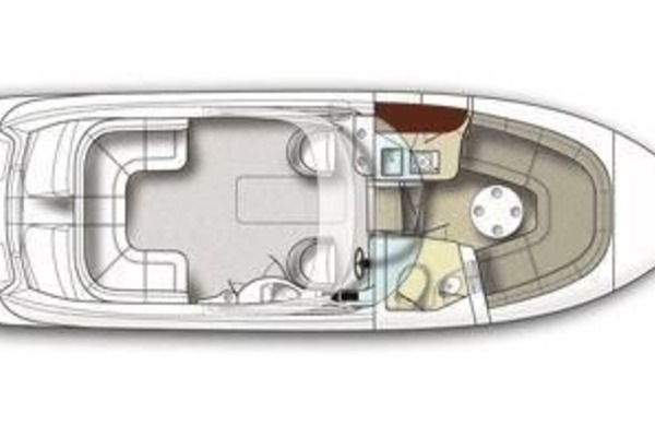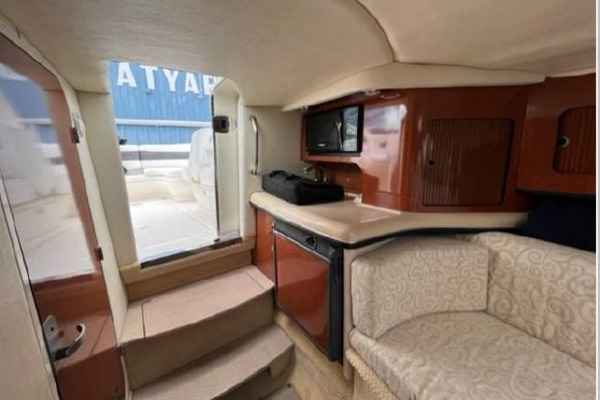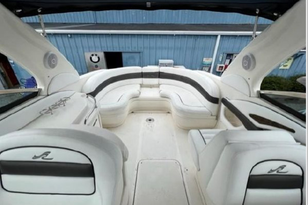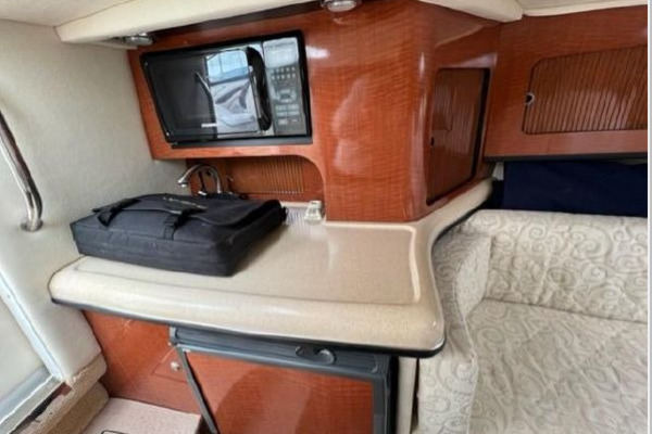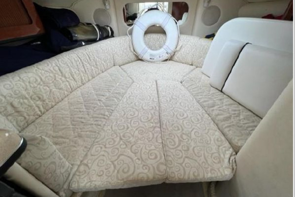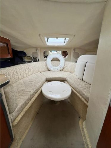 Below she has a large U-shaped dinette forward that converts to a double berth for overnighting. Aft to port is the galley and opposite to starboard is the fully enclosed head with vanity, toilet and telephone shower. The interior is light and bright with beige fabrics and high gloss cabinetry in the galley. The centerline companionway leads to the helm and cockpit area. The helm is to starboard and behind is a wet bar with sink and storage under. To port are fore and aft facing mates seats. She offers a nice wrap around seating area aft with access to the swim platform in the center. The aft seating area has a hydraulic lift for easy access to the engine compartment.