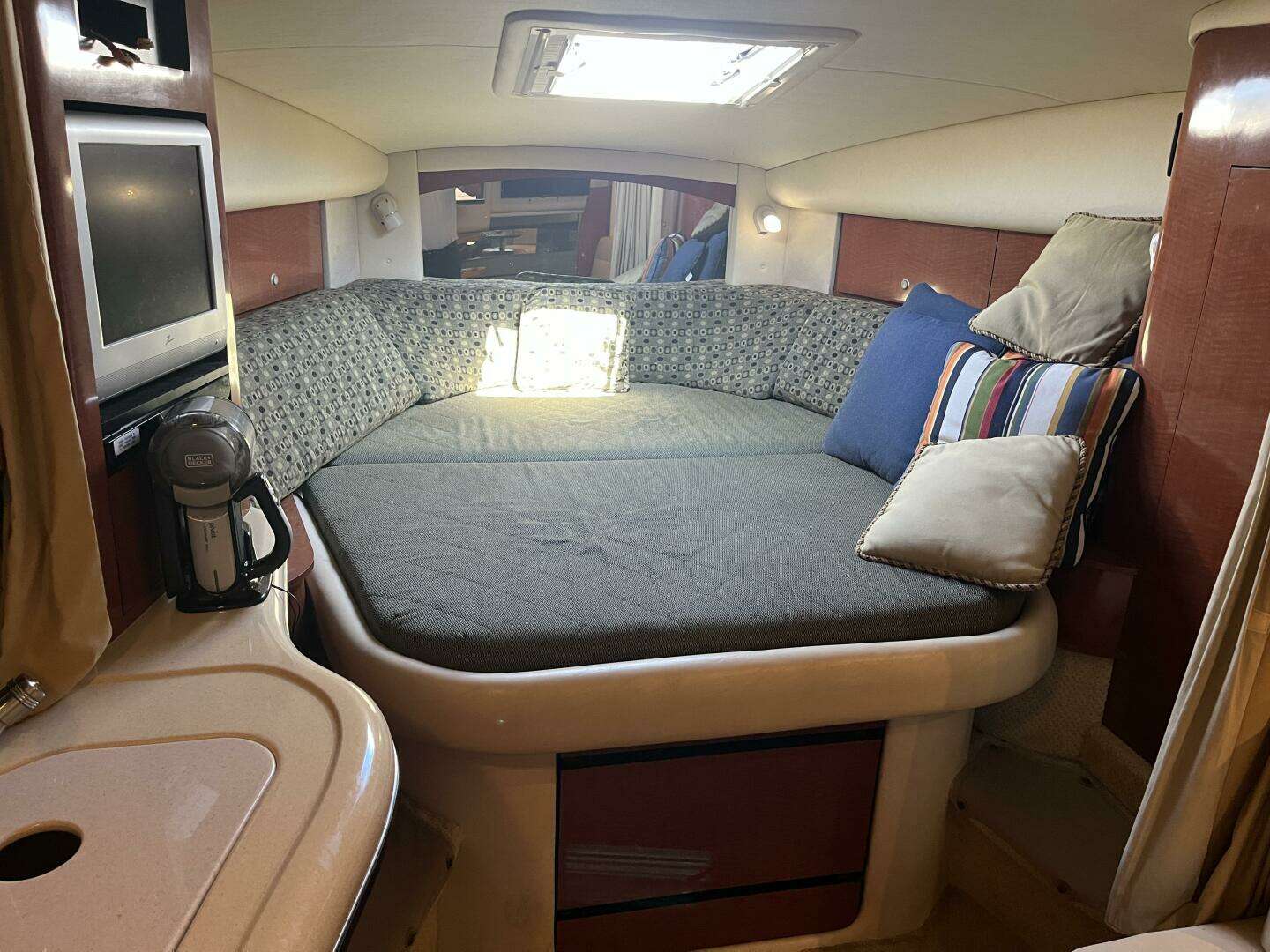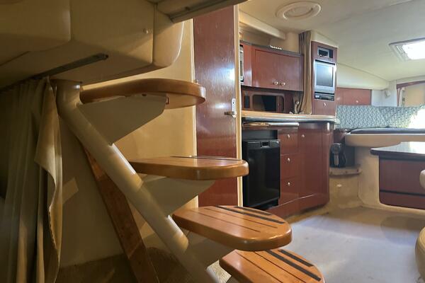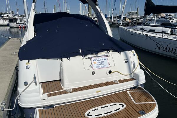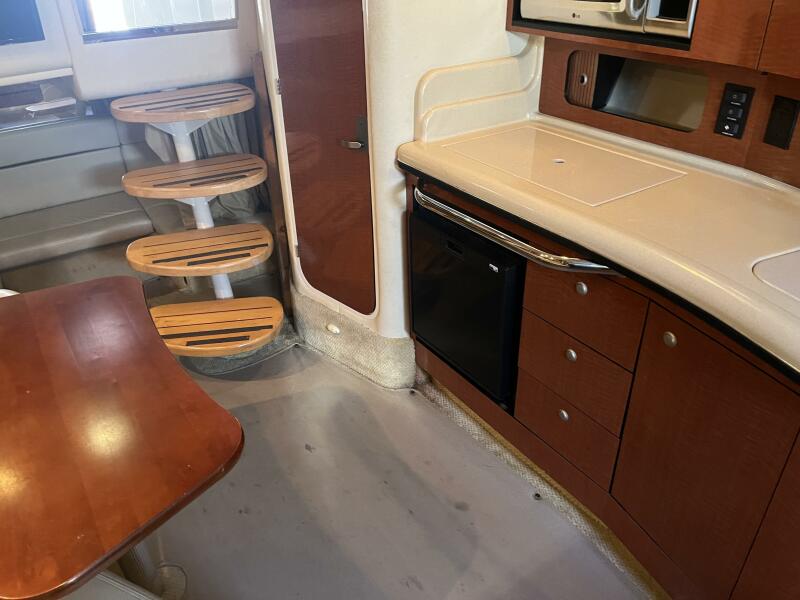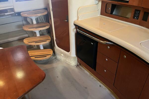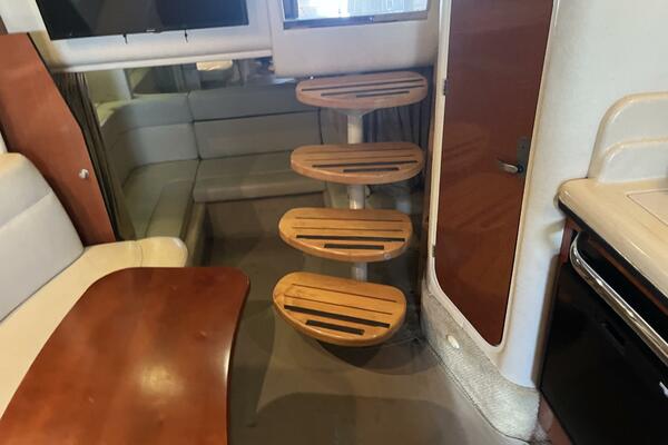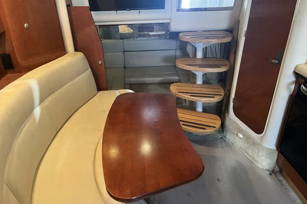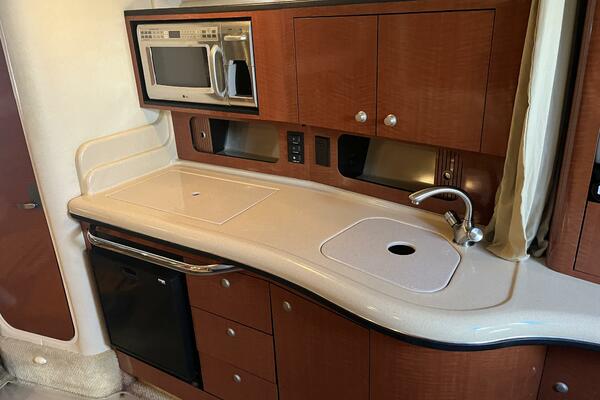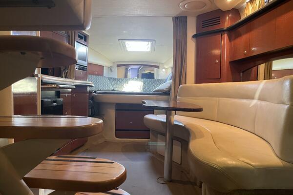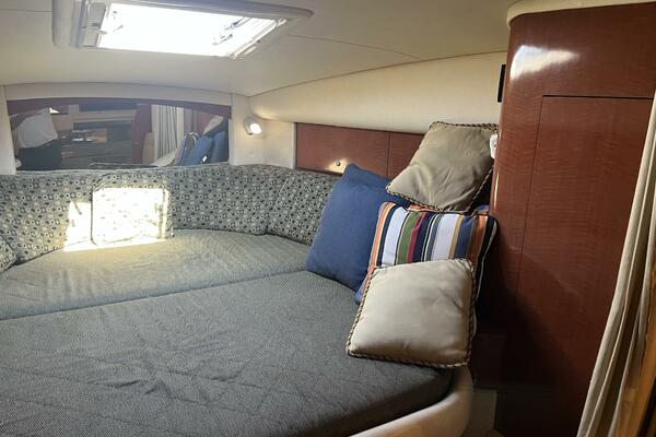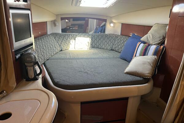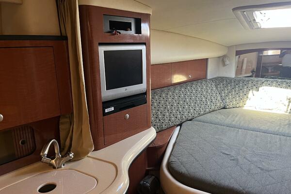 In the cockpit, a U-shaped aft lounge includes a removable cocktail table. Engine access is made easy with the cockpit sole lifting at the push of a button. A minor drawback is the narrow side decks. Powered by V-drive inboard MerCruiser 5.7L 300hp engines, the 320 Sundancer cruises at 24-26 knots, reaching top speeds in the low 30s.