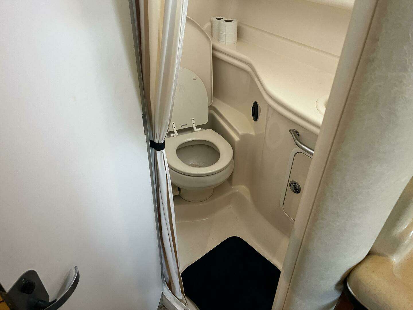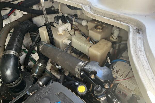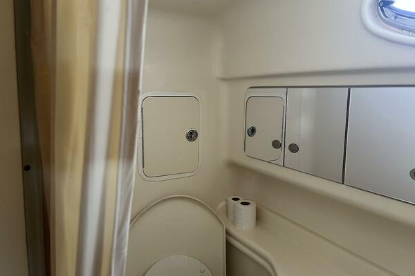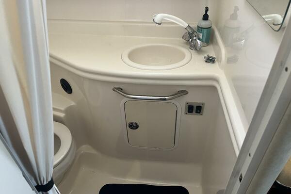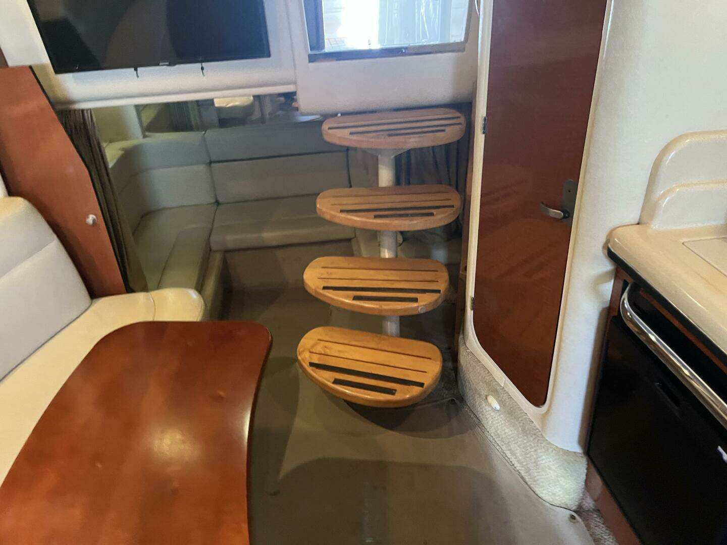 In the cockpit, a U-shaped aft lounge includes a removable cocktail table. Engine access is made easy with the cockpit sole lifting at the push of a button. A minor drawback is the narrow side decks. Powered by V-drive inboard MerCruiser 5.7L 300hp engines, the 320 Sundancer cruises at 24-26 knots, reaching top speeds in the low 30s.