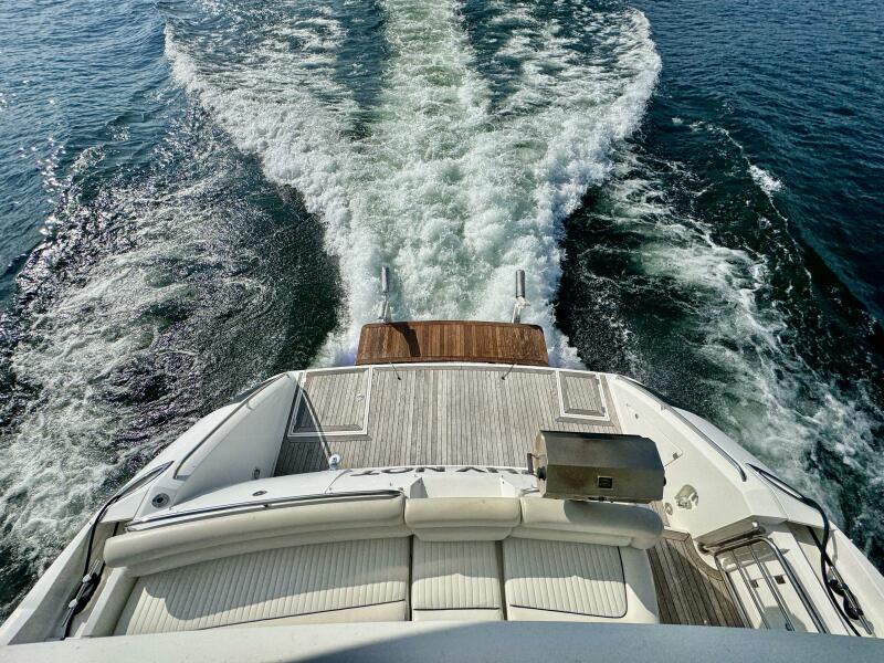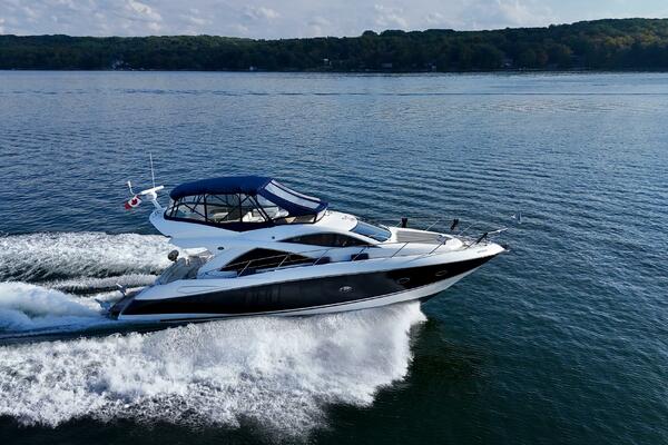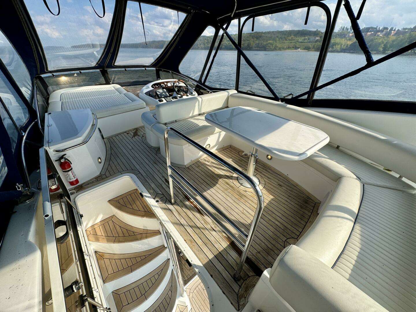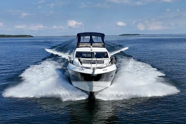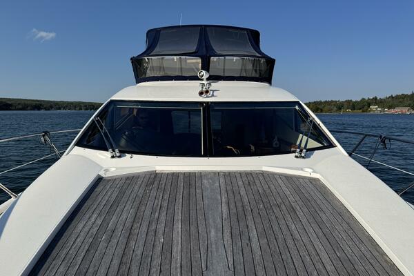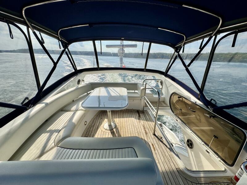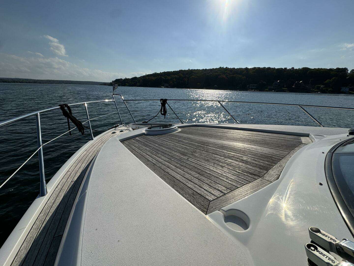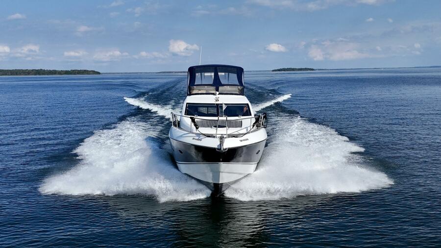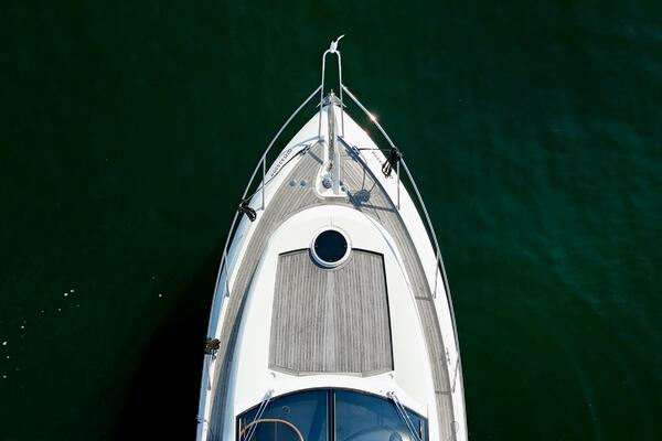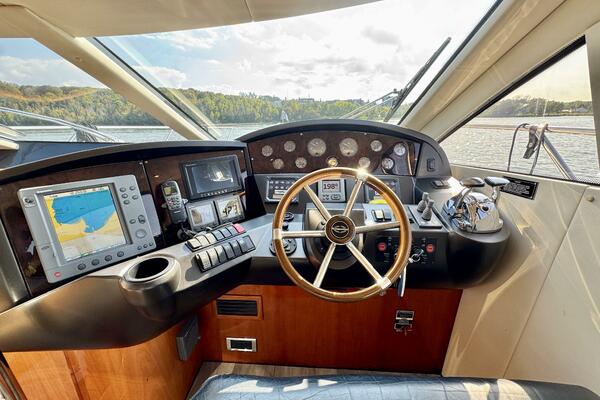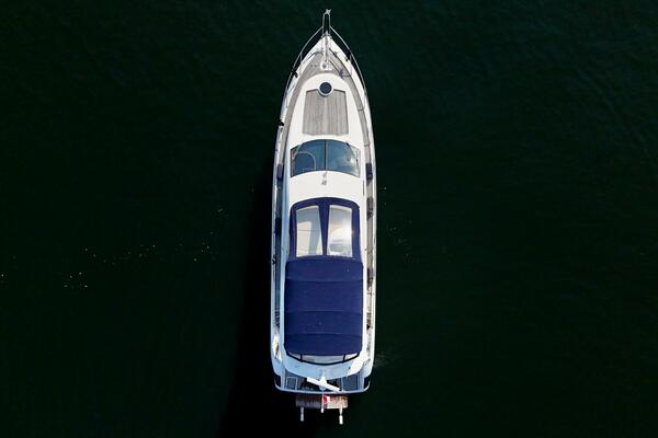 A rare opportunity to own a low-hour (560), luxurious UK-built vessel that has exclusively cruised freshwater. The current owner purchased this vessel in 2007 and has continuously maintained and upgraded the vessel, with the added bonus of always wintering in indoor heated storage. Her spacious interior, an eye-popping blend of highgloss cherry woodwork, leather salon seating, and full teak decks, gives this vessel a true motor yacht feel. A full-beam amidships master with island berth, forward VIP stateroom with en-suite head, and a second guest stateroom with twin beds provide plenty of accommodations. The galley is down—“sunken,” as it is in most European motor yachts—and the lower helm is two steps up from the aft salon. Huge cabin windows offer panoramic outside views, and vertical hull ports flood the master suite with lighting. Built on a deep-V hull with moderate beam and prop pockets to reduce shaft angles, she’ll cruise at 25–26 knots (30+ knots top).