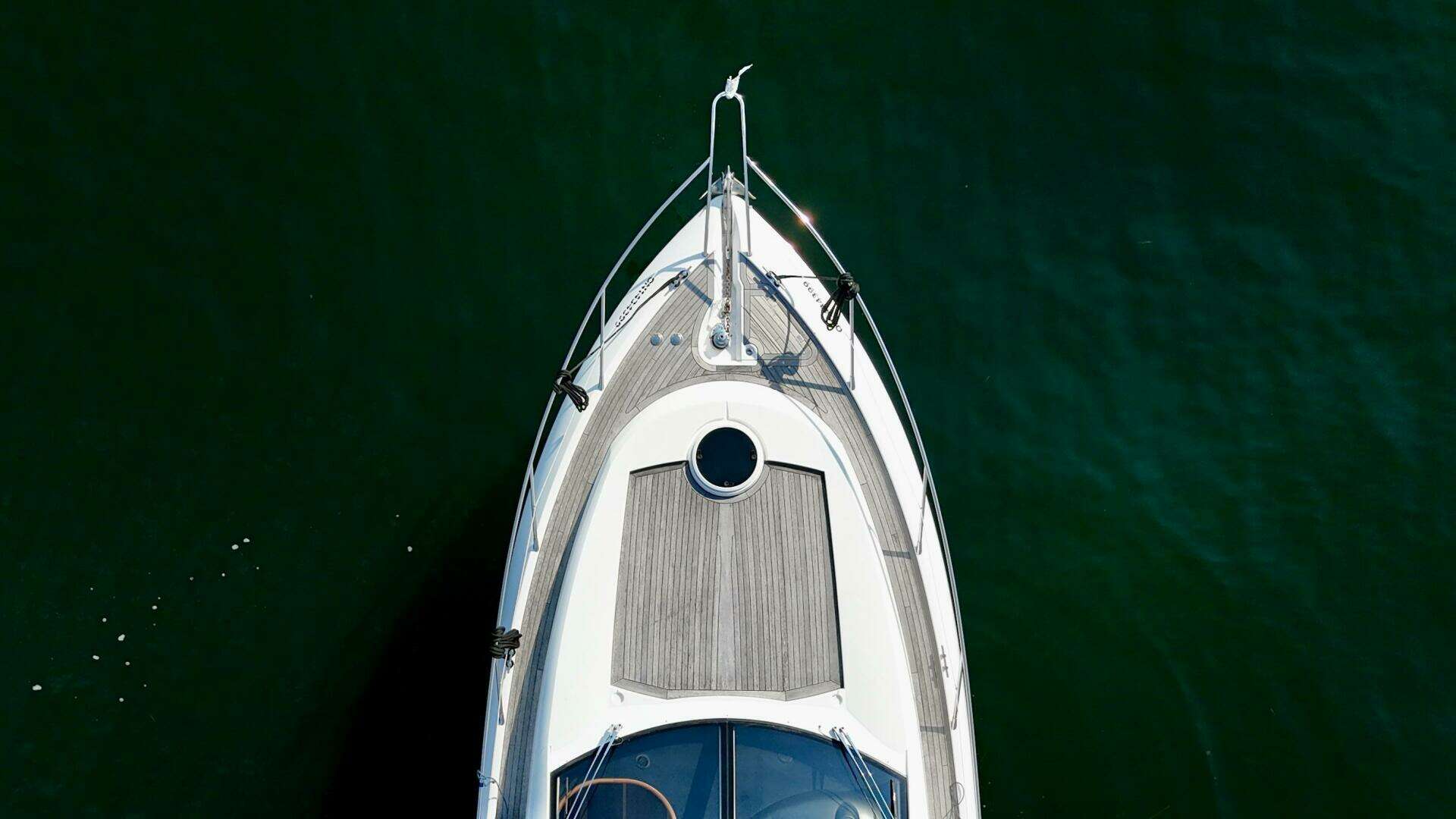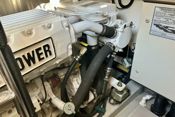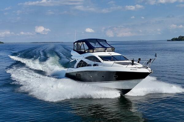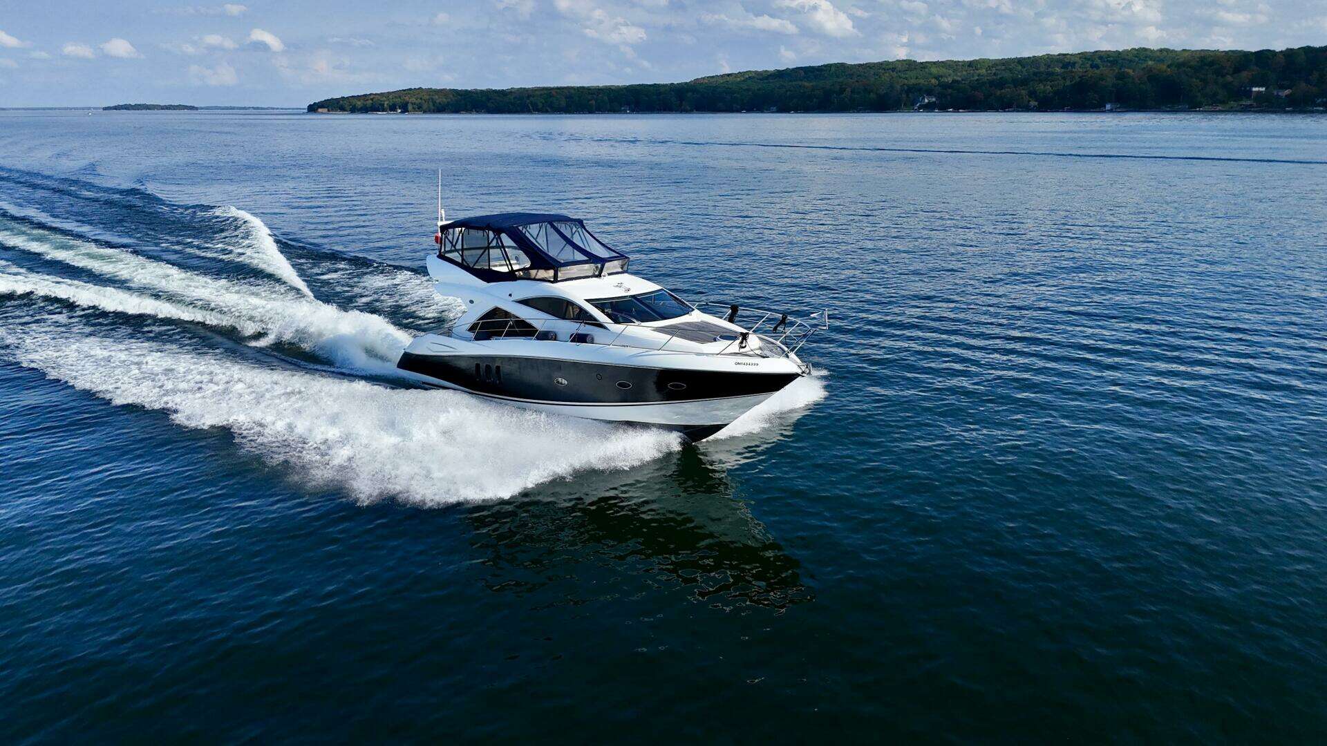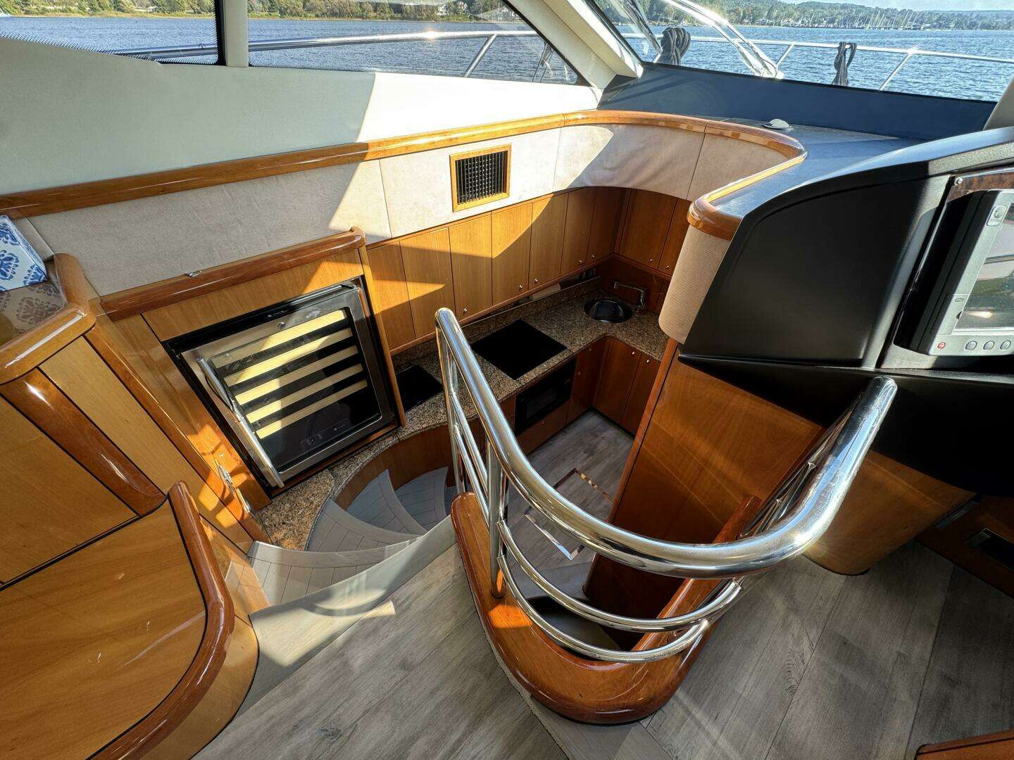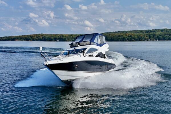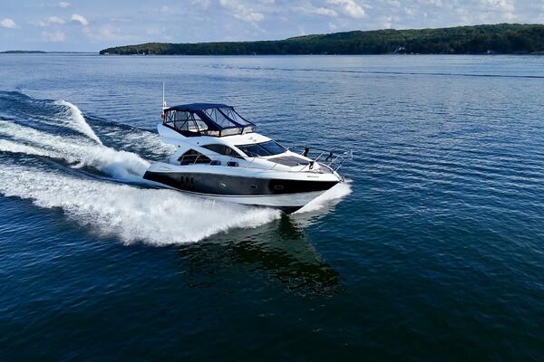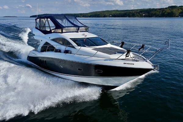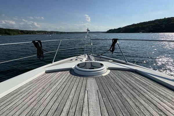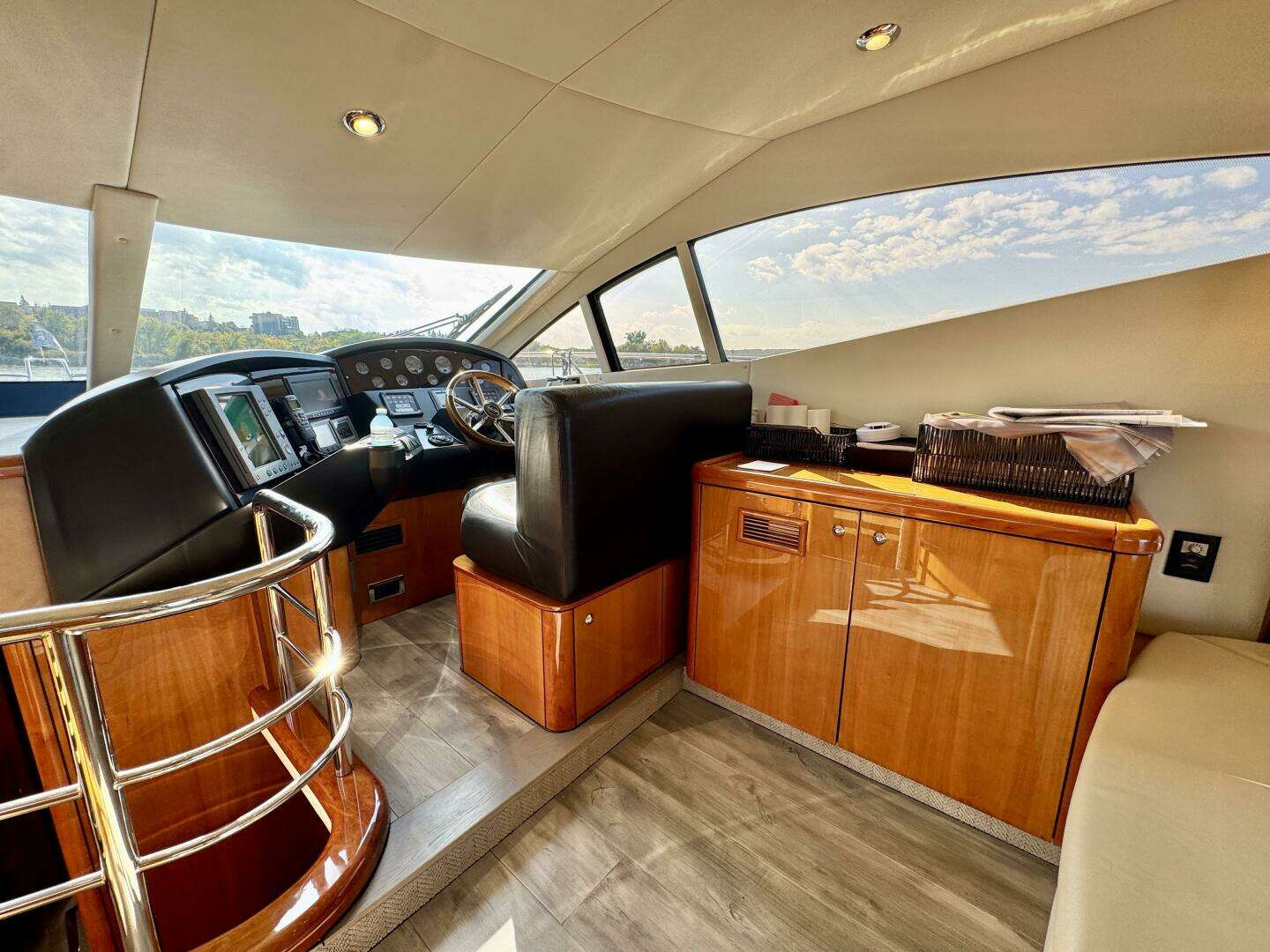 A rare opportunity to own a low-hour (560), luxurious UK-built vessel that has exclusively cruised freshwater. The current owner purchased this vessel in 2007 and has continuously maintained and upgraded the vessel, with the added bonus of always wintering in indoor heated storage. Her spacious interior, an eye-popping blend of highgloss cherry woodwork, leather salon seating, and full teak decks, gives this vessel a true motor yacht feel. A full-beam amidships master with island berth, forward VIP stateroom with en-suite head, and a second guest stateroom with twin beds provide plenty of accommodations. The galley is down—“sunken,” as it is in most European motor yachts—and the lower helm is two steps up from the aft salon. Huge cabin windows offer panoramic outside views, and vertical hull ports flood the master suite with lighting. Built on a deep-V hull with moderate beam and prop pockets to reduce shaft angles, she’ll cruise at 25–26 knots (30+ knots top).