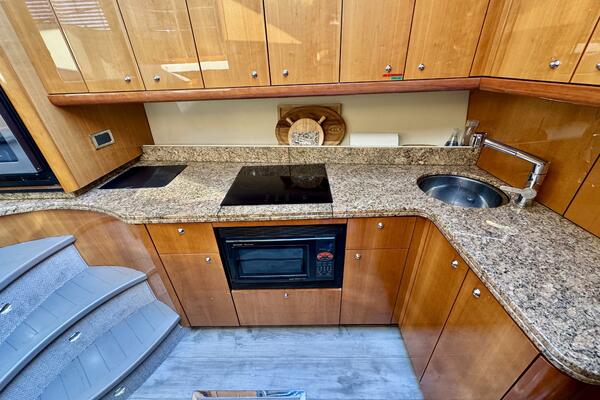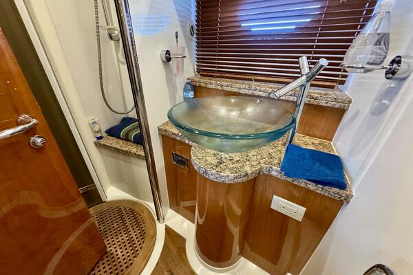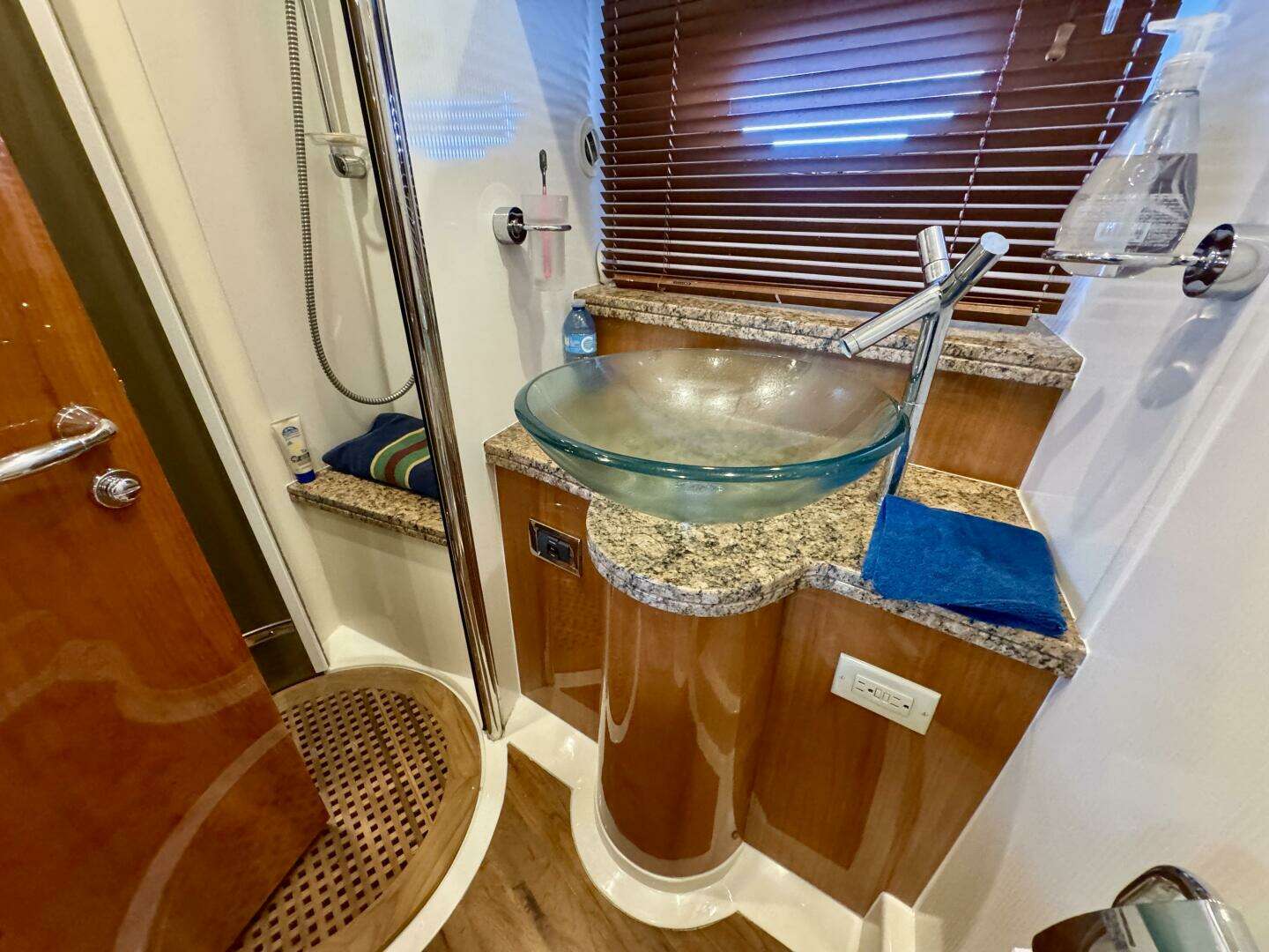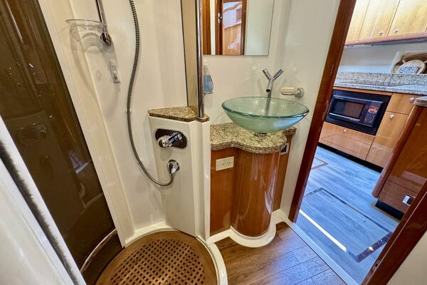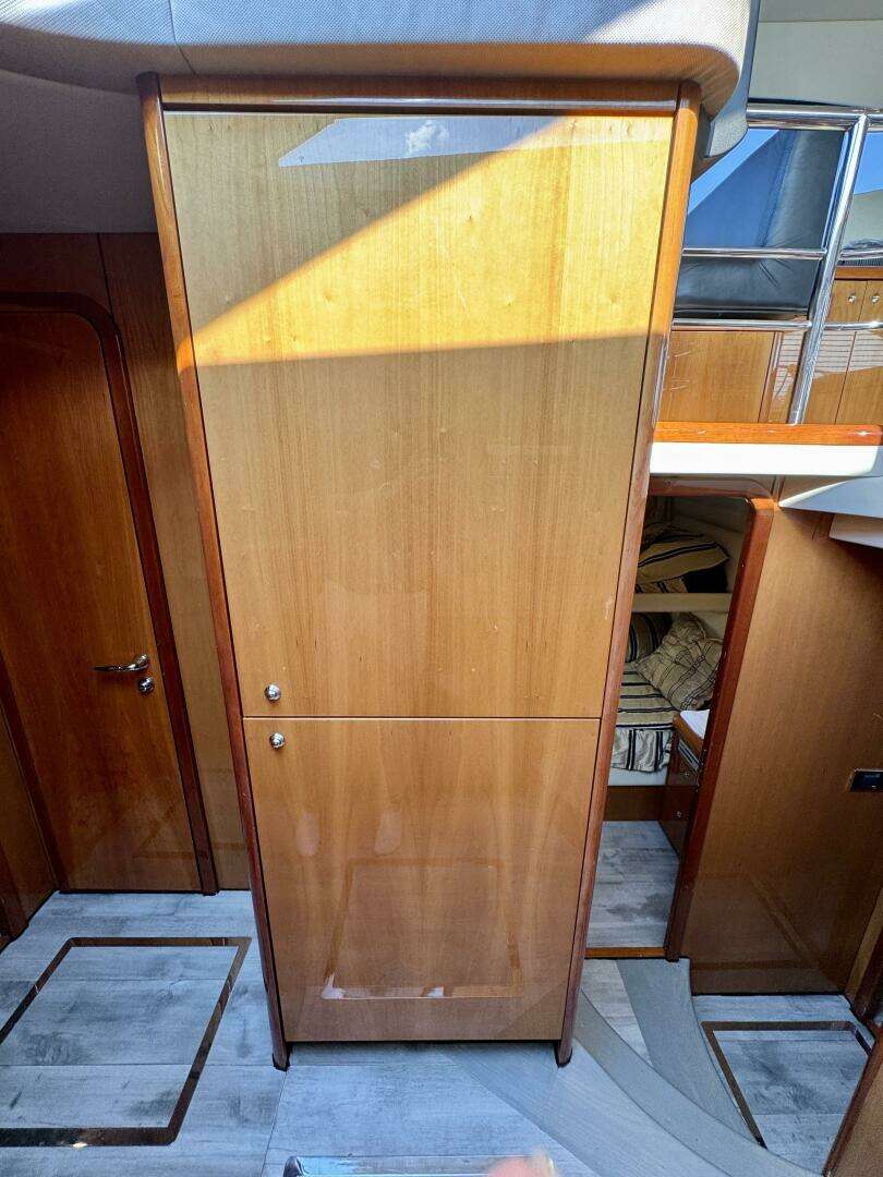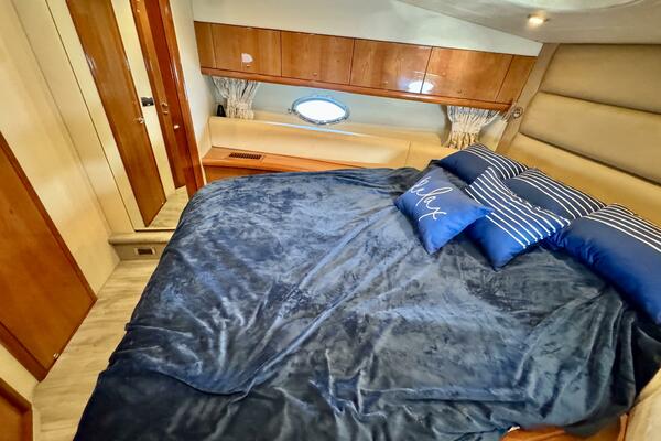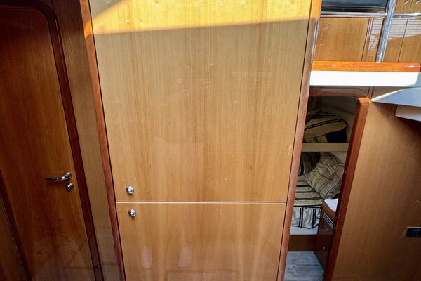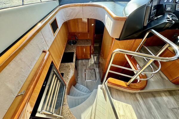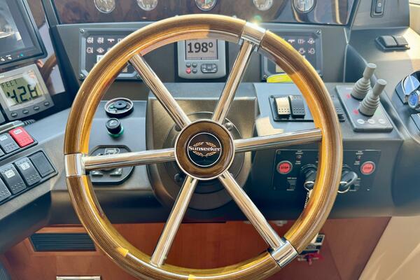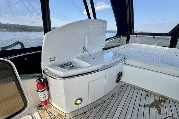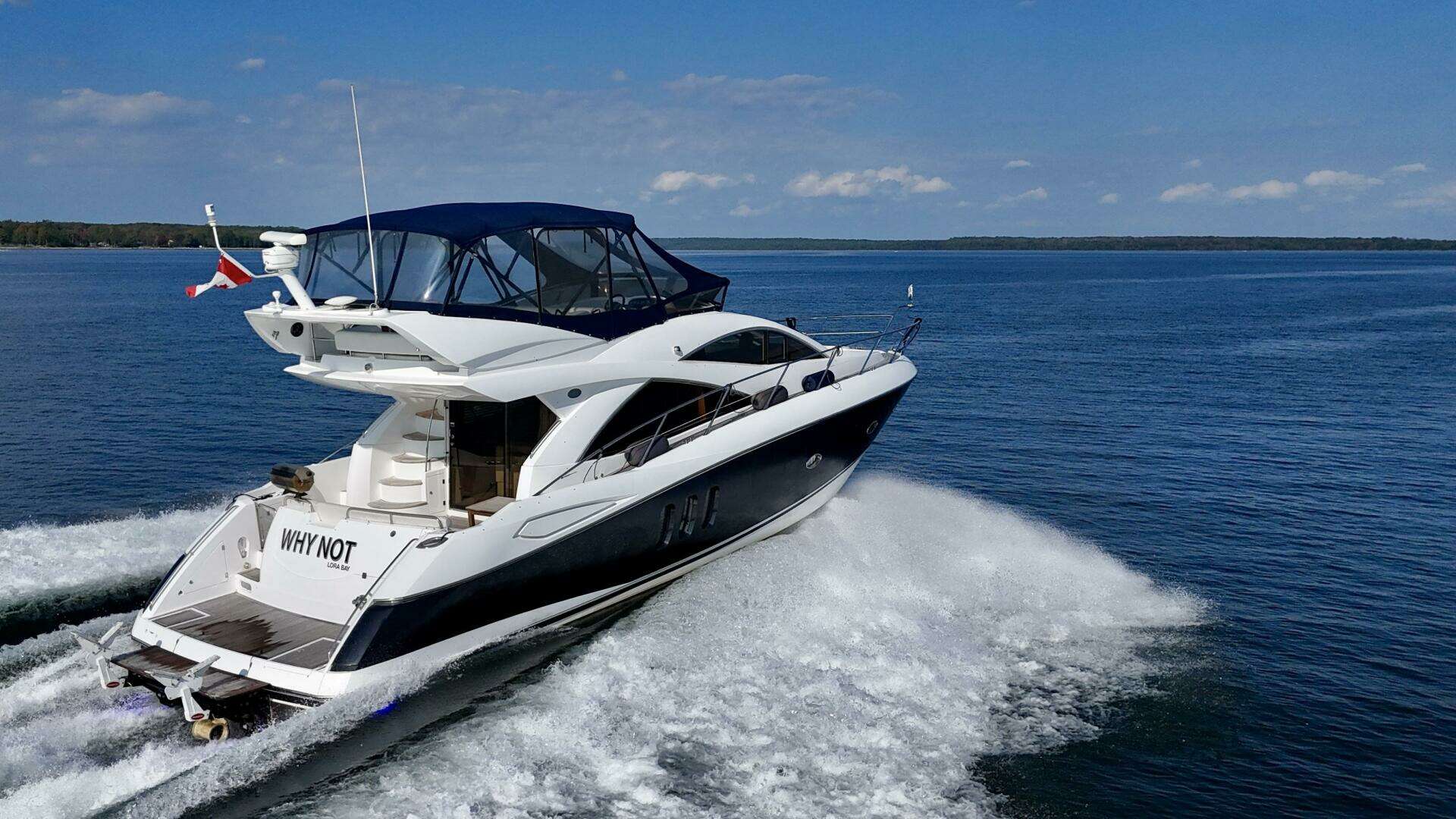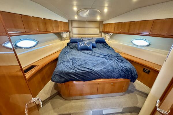 A rare opportunity to own a low-hour (560), luxurious UK-built vessel that has exclusively cruised freshwater. The current owner purchased this vessel in 2007 and has continuously maintained and upgraded the vessel, with the added bonus of always wintering in indoor heated storage. Her spacious interior, an eye-popping blend of highgloss cherry woodwork, leather salon seating, and full teak decks, gives this vessel a true motor yacht feel. A full-beam amidships master with island berth, forward VIP stateroom with en-suite head, and a second guest stateroom with twin beds provide plenty of accommodations. The galley is down—“sunken,” as it is in most European motor yachts—and the lower helm is two steps up from the aft salon. Huge cabin windows offer panoramic outside views, and vertical hull ports flood the master suite with lighting. Built on a deep-V hull with moderate beam and prop pockets to reduce shaft angles, she’ll cruise at 25–26 knots (30+ knots top).