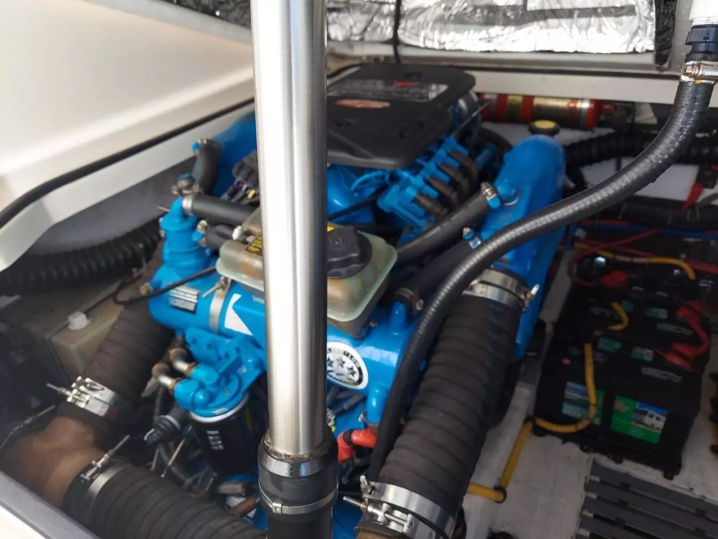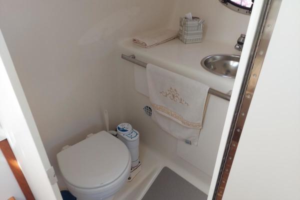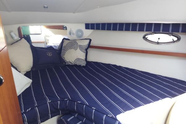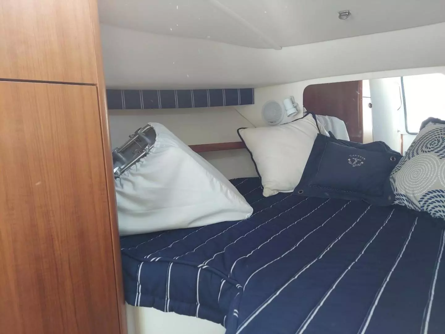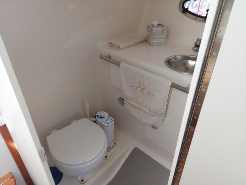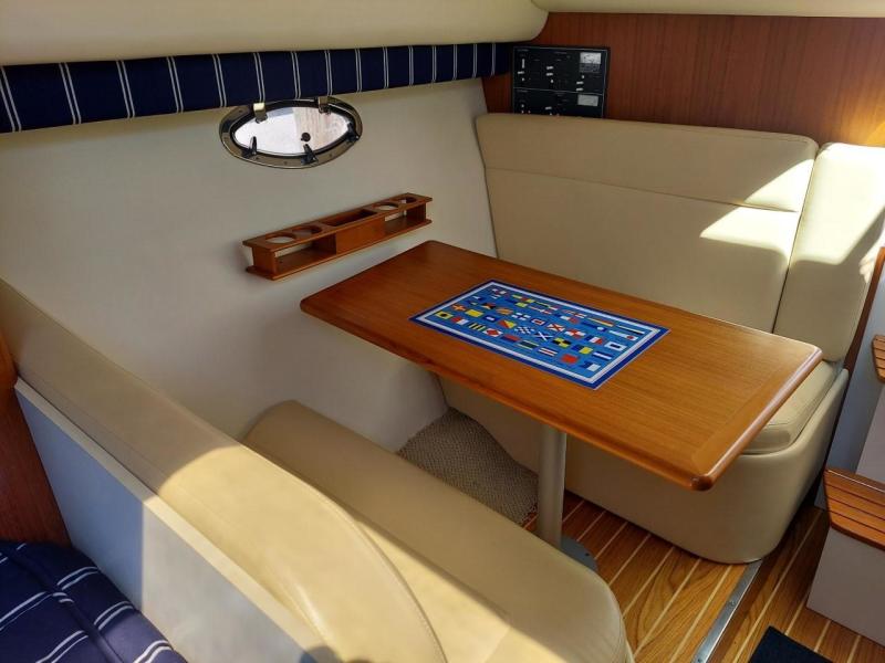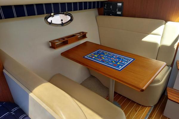 Forward you have a offset double bed with a hanging locker and ventilation hatch. Aft to starboard is the convertible dinette. Aft to port isa hanging locker followed by the galley area. The enclosed head with vanity, mirror and opening port are aft. Up a couple of steps to the helm deck with the helm to starboard followed by a rear facing seat. Helm seat is double for 2 people. On the port side you have an L-shaped Settee seat. Aft to the cockpit area with a fold away aft bench seat, 2- aft facing seats, coaming bolsters and a transom door out to the swim platform.
