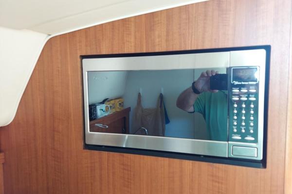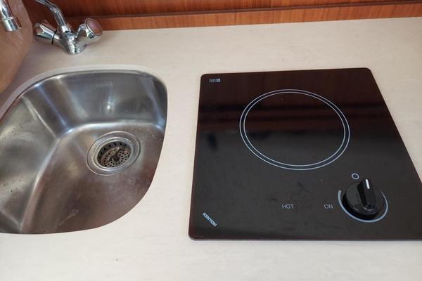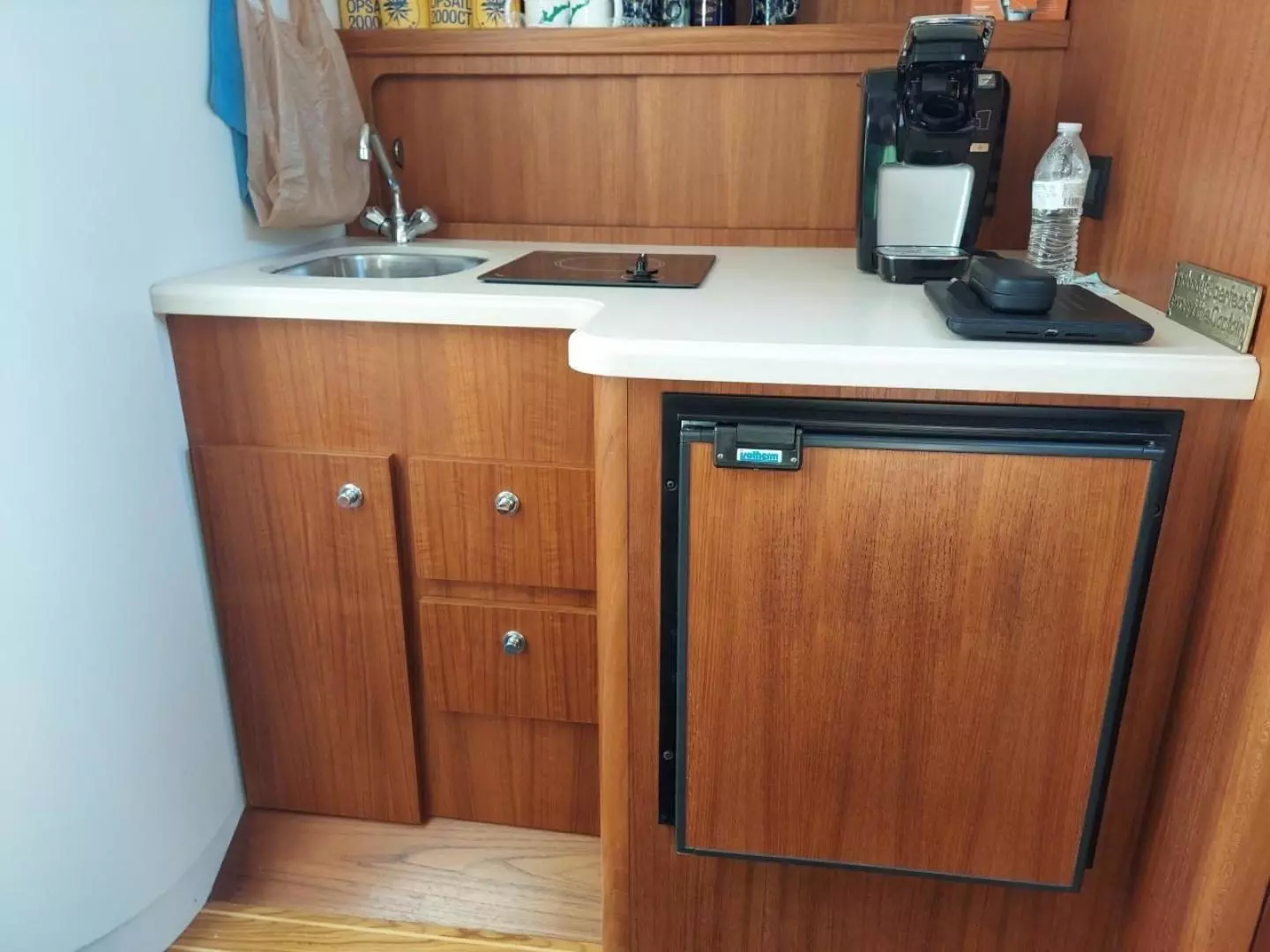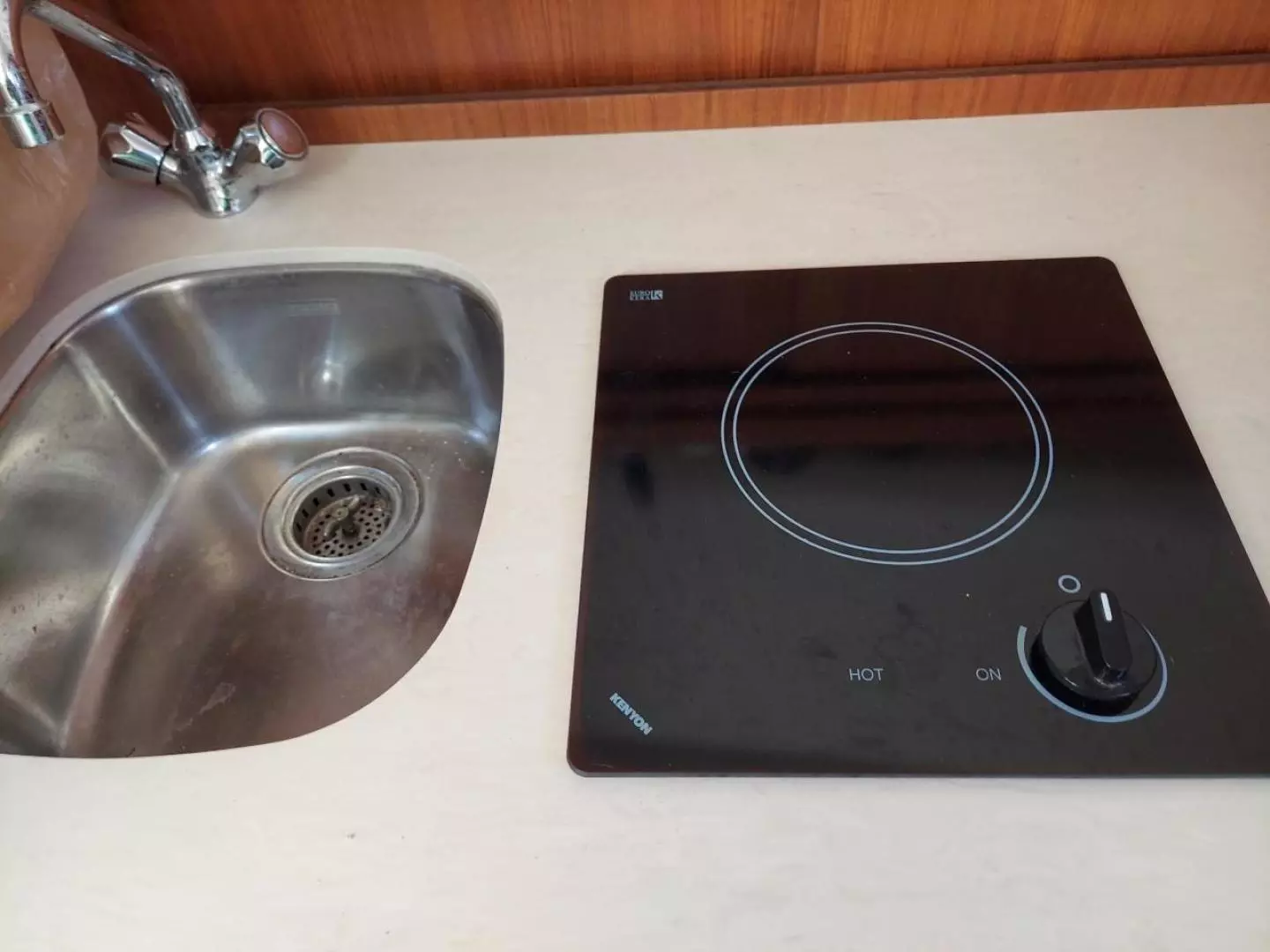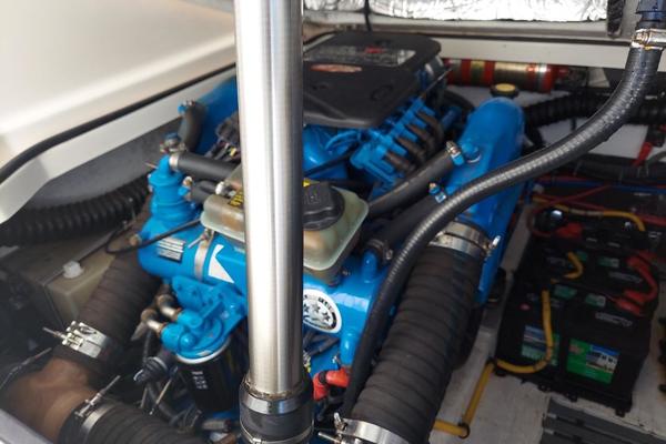 Forward you have a offset double bed with a hanging locker and ventilation hatch. Aft to starboard is the convertible dinette. Aft to port isa hanging locker followed by the galley area. The enclosed head with vanity, mirror and opening port are aft. Up a couple of steps to the helm deck with the helm to starboard followed by a rear facing seat. Helm seat is double for 2 people. On the port side you have an L-shaped Settee seat. Aft to the cockpit area with a fold away aft bench seat, 2- aft facing seats, coaming bolsters and a transom door out to the swim platform.