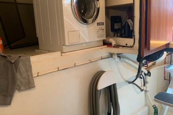 The accommodations include two sleeping quarters with private heads and stand-up showers. Forward, there are two cabins with twin single berths and a dedicated head. The main salon features a spacious living area with a breakfast nook and a round dining table. Forward is a fully equipped galley with steps leading down to additional storage and a washer/dryer.