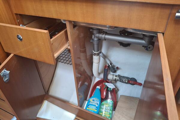 - Fully equipped galley with double SS sink, 3 burner propane stove and microwave