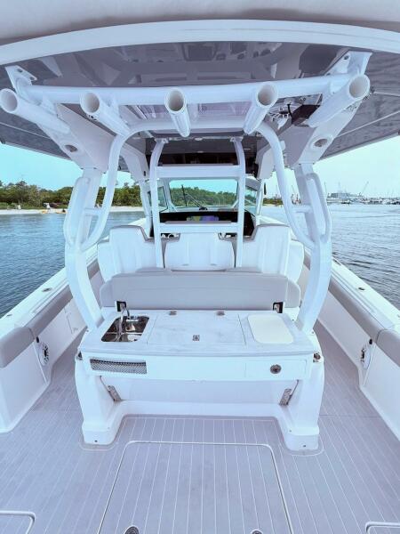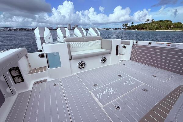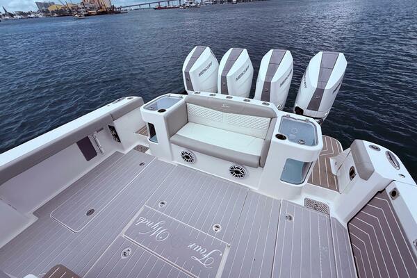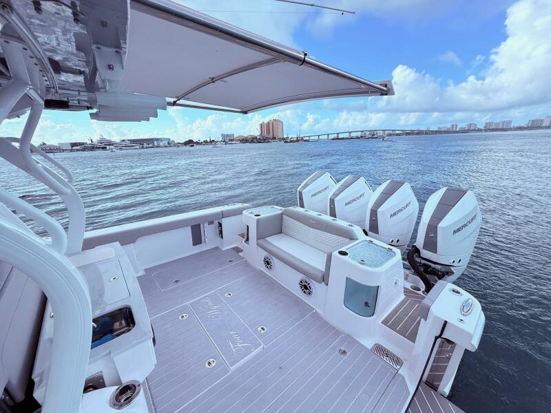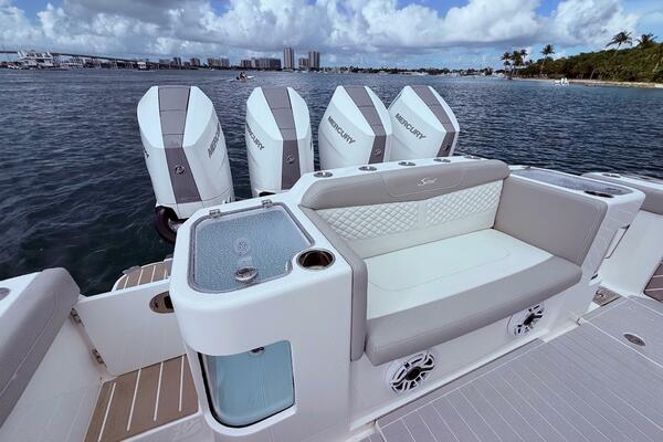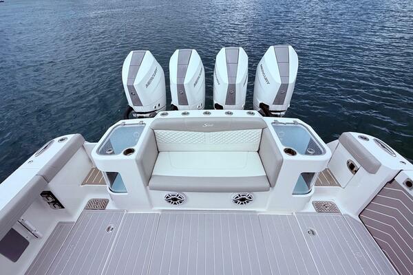 2024 Scout 400 LXF boat deck with seating, ocean view, and four outboard engines.