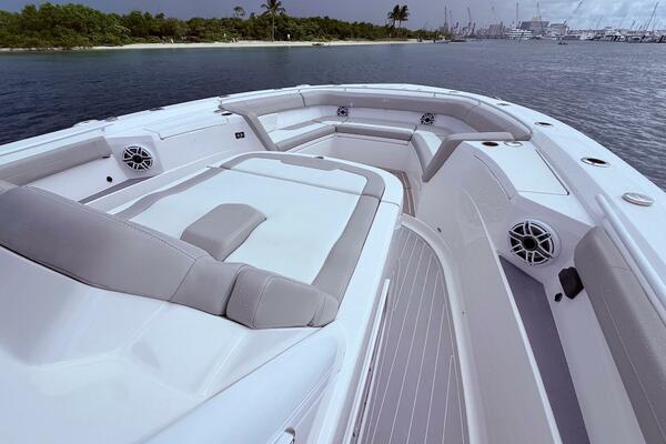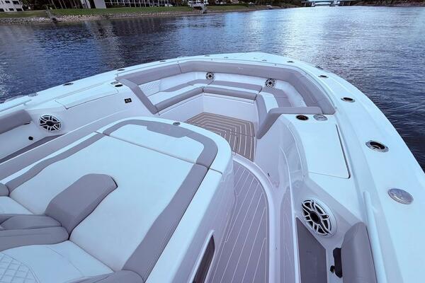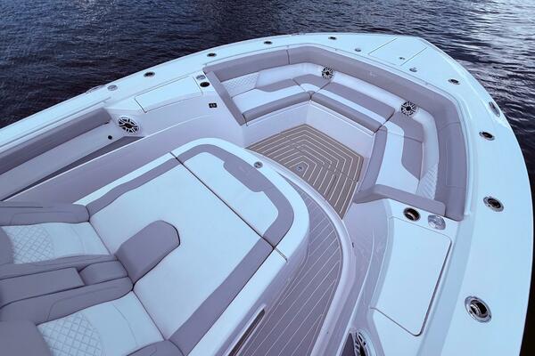 Luxurious seating on 2024 Scout 400 LXF boat, featuring elegant design and spacious layout.