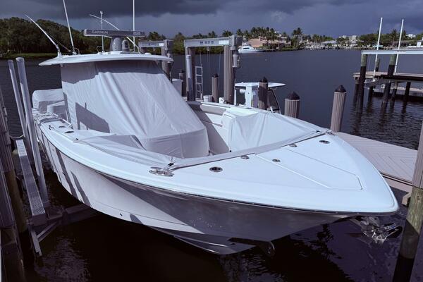 2024 Scout 400 LXF boat docked under cloudy skies.