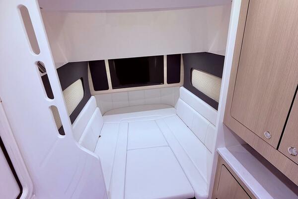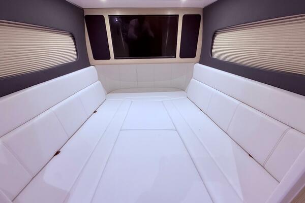 Luxurious interior cabin of 2024 Scout 400 LXF boat with white seating.