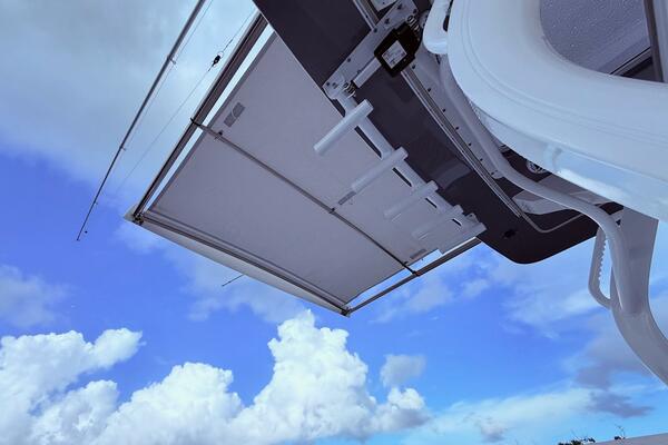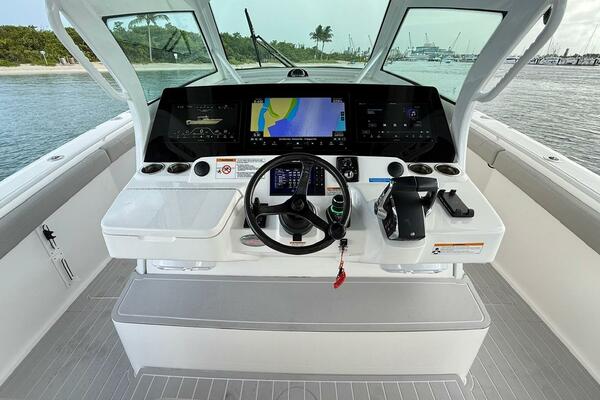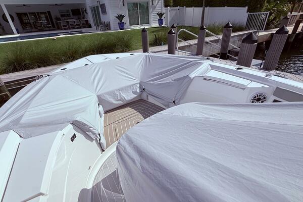 The exterior is equally well designed, with sleek window lines that not only provide striking curb appeal but also flood the interior with natural light. Wide side decks and versatile decking layouts make docking and onboard movement safe and easy. The expansive aft deck and flybridge provide excellent entertaining areas, protected by the new bimini top, and offer outstanding visibility whether underway or at anchor.