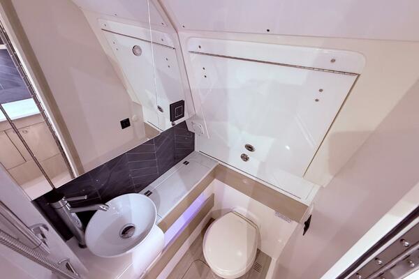 2024 Scout 400 LXF boat bathroom with modern sink and toilet.