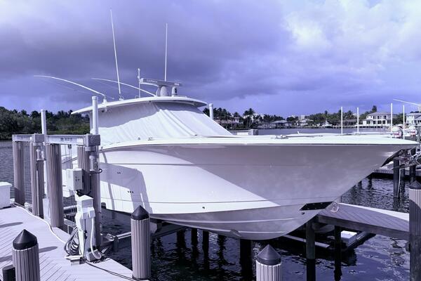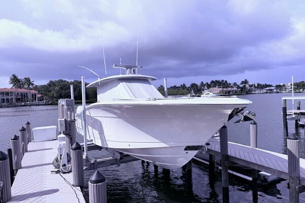 2006 Carver 43 Motor Yacht docked, rear view, named "Liquid Asset," in Marathon, FL.