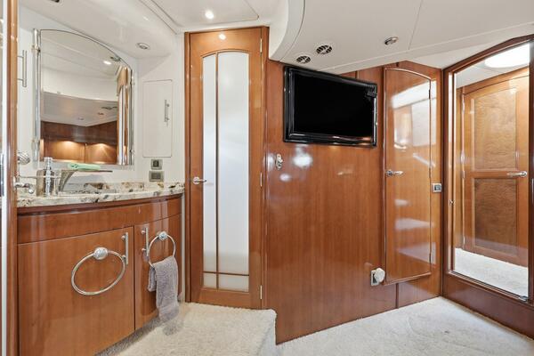 The Carver 56 Voyager is a three-stateroom two-head layout with a raised Pilothouse and a large Enclosed Bridge Deck. The Master Stateroom is midship with an over-sized Island Queen Berth. The Master features separate Head and Shower/tub closets and a full sized washer and dryer. The VIP Stateroom is forward and also features an Island Queen Berth. The third stateroom features over and under single bunks, each with their own TV! The Guest Head has a privacy entrance from the VIP as well as a day-head entrance.