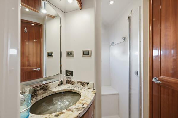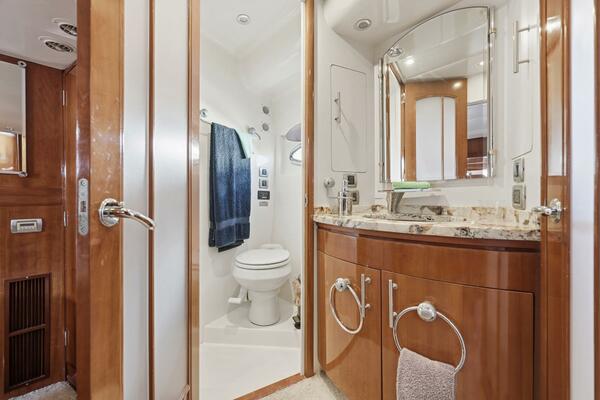 The Carver 56 Voyager offers a multitude of living spaces. The salon seamlessly flows into the galley, where top-of-the-line appliances and ample counter space make meal preparation a joy. There are three staterooms onboard, including a luxurious master suite and two guest cabins, ensuring that everyone on board enjoys the utmost in privacy and comfort.