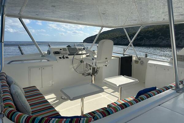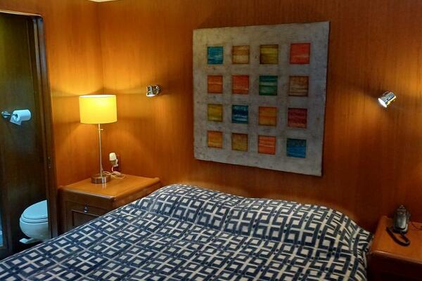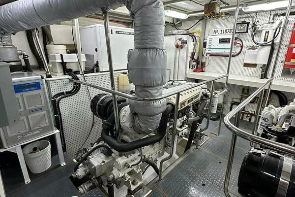 Walk-in closets and plenty of built-in dresser drawers and storage throughout. Walking forward out of the main saloon is the engine room access door – complete stand-up room throughout the engine room. The cockpit is large enough for fishing and offers great space for staging diving trips and boarding the tender or just stepping off and swimming. The 65 affords plenty of living space and privacy for a large cruising family or for those who love to entertain while they travel.