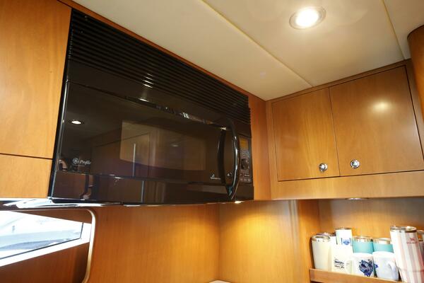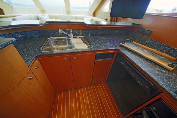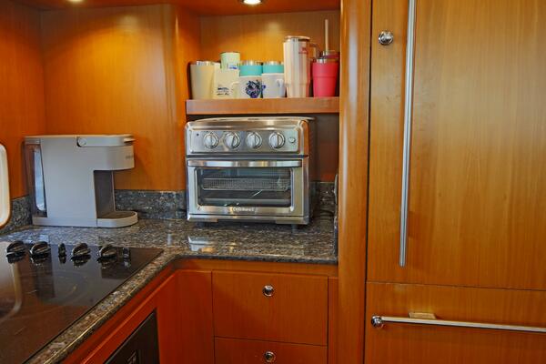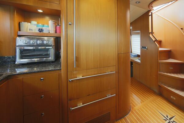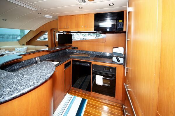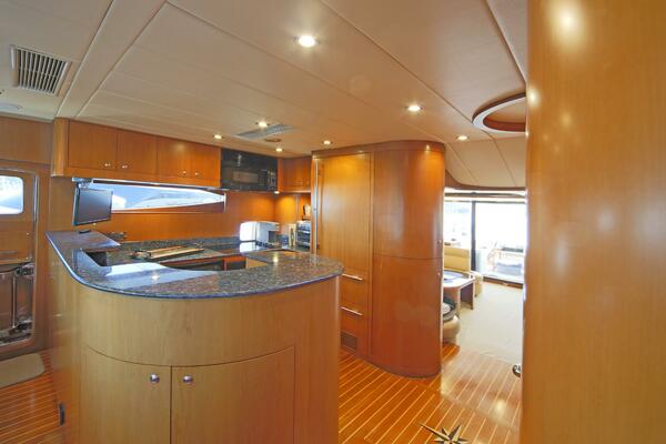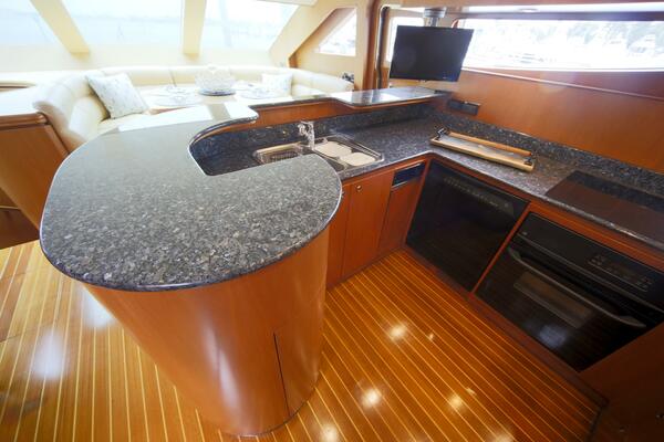 One step up and just forward of the salon is the open galley. The sole is teak and holly, countertops are granite. The galley is U-shaped off the starboard side of the yacht. There is a U-shaped dinette forward, with a country kitchen arrangement. ICOM VHF radio in the galley. Forward of the galley but open to the area is a small cherry table and a C-shaped settee to seat four.
