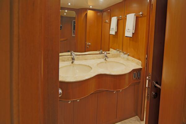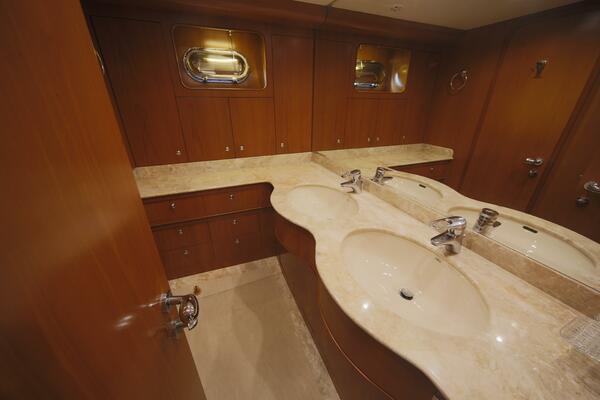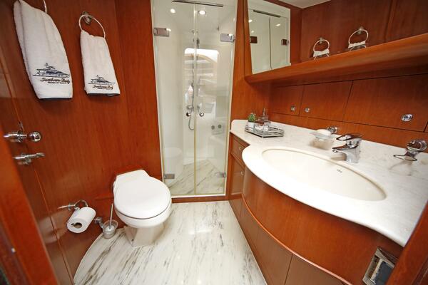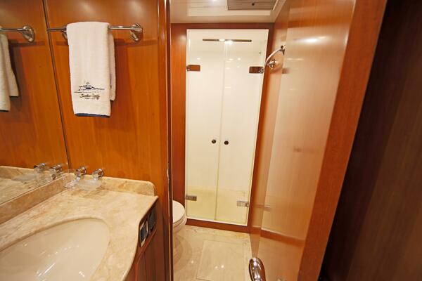 The master head is entered from the aft starboard corner of the master stateroom. The sole is a marble slab with a contrasting border and brass inlay. The twin bow front vanity has storage below, two under-mount sinks, and a marble countertop. There are ample mirrors and medicine cabinet storage. The Head Hunter Royal Flush toilet is centerline in its own enclosed room with a stall shower to port. The shower fixture is hand-held or wall-mountable, the shower has a clear glass shower door, and a marble tile sole.