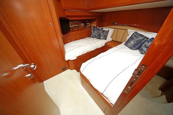 Some owners might use this for crew, others as an additional guest cabin. Two berths are located athwartships with a nightstand with two drawers between and a hanging locker above.