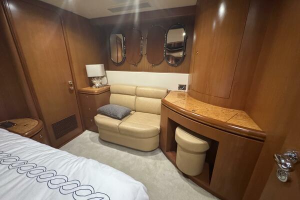 To starboard starting aft is a walk-in locker with a safe, a cabinet with an AM/FM/ DVD system, and a satellite receiver. Next forward is a two-person settee with storage below. Furthest forward is a vanity and additional storage lockers above. Also in this stateroom is a Samsung 21" flat screen TV.